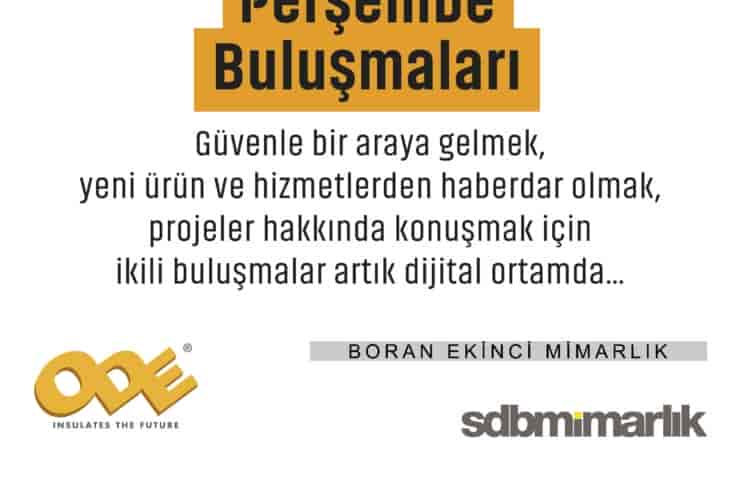 Yaşadığımız pandemi ortamında güvenle bir araya gelmek, yeni ürün ve hizmetlerden haberdar olmak, projeler hakkında konuşmak için ikili buluşmalar artık dijital ortamda… IstanbulSMD Perşembe Buluşmaları’nın ilki ODE yalıtım ile SDB Mimarlık, Boran Ekinci Mimarlık ile ekipleri ve ISMD Genel Sekreteri Dilek Safer’in katılımıyla gerçekleşti. Buluşmalara katılmak için bize ulaşabilirsiniz. ...