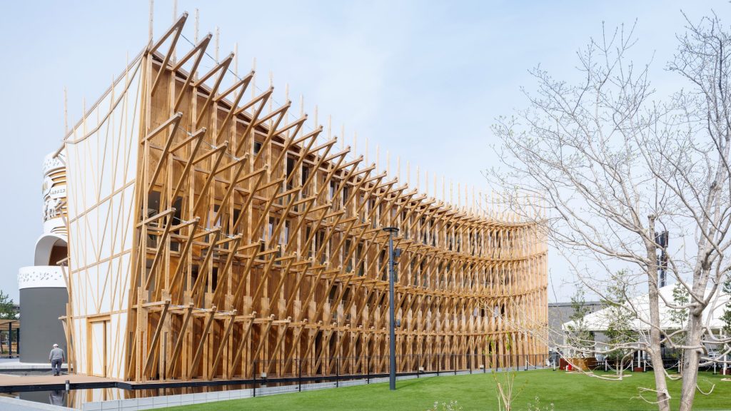 17 metre yüksekliğindeki pavyon, Bahreyn’in denizcilik mirasından yola çıkarak, bir zamanlar ağır yükleri taşımak için kullanılan bölgenin geleneksel dhow teknelerinden esinleniyor. 995 m² büyüklüğündeki pavyon, 3.000 parça Japon sedirinden inşa edilen bir ahşap ağla çevrili. Bu ağ, tekne kirişlerini andıran çıkıntılarla deniz hareketini çağrıştırıyor. Ön cephesini saran yarı saydam membran ise geleneksel dhow yelkenlerine gönderme yaparken, yapıya hafiflik, geçirgenlik ve pasif iklim kontrolü sağlıyor.