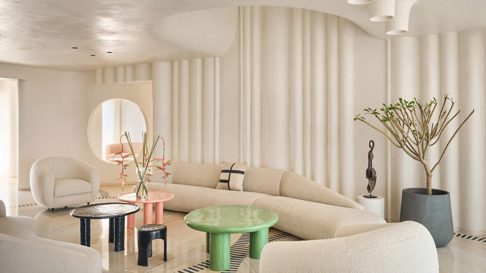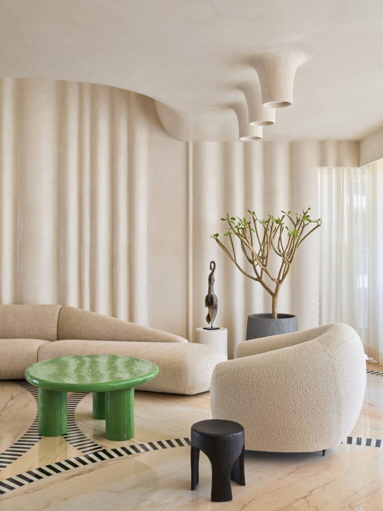 Şeftali tonları, siyah ve beyazın hakim olduğu zemin, daire genelindeki renk şemasına uyumlu bir şekilde eklemleniyor. Hint evi için hiç de alışıldık bir renk paleti tercih etmeyen ofis, renkleri doğadan aldıkları ilhamın, eğrilerin ve yuvarlak formların yönlendirmesini tercih ediyor ve sonuç minimal ve fütüristik bir dile sahip bu sıra dışı yaşam alanı oluyor.