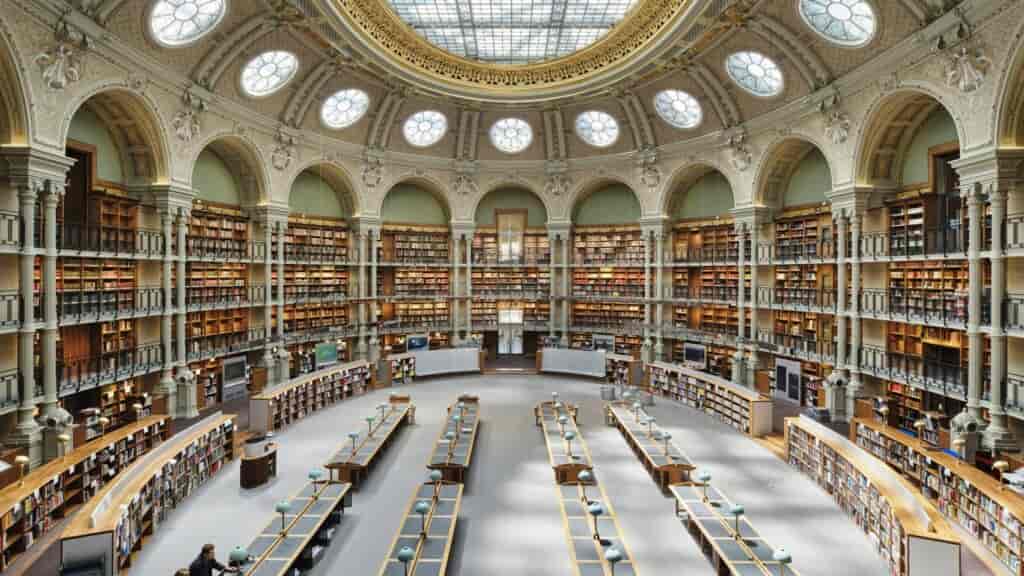 Fransa Ulusal Kütüphanesi, 19. yüzyılın sonlarına doğru mimar Henri Labrouste tarafından tamamlanmış ve Beaux Arts mimari stili ince çelik sütunlar ve kemerlerle donatılmış. Fakat 20. Yüzyılın sonuna doğru kütüphanenin eskimesi ile harabe hale geldikten sonra Bruna Gaudin Architectes yapıya geçmiş karakterini yeniden kazandırıyor ve şu sözlerle açıklıyor: “Dün kendi içine kapanmış, büyük, ihtişamlı, yıpranmış, parçalanmış, karanlık ve harap haldeki hazine sandığı şimdi yeni, ışık dolu bir kimlik kazandı.”