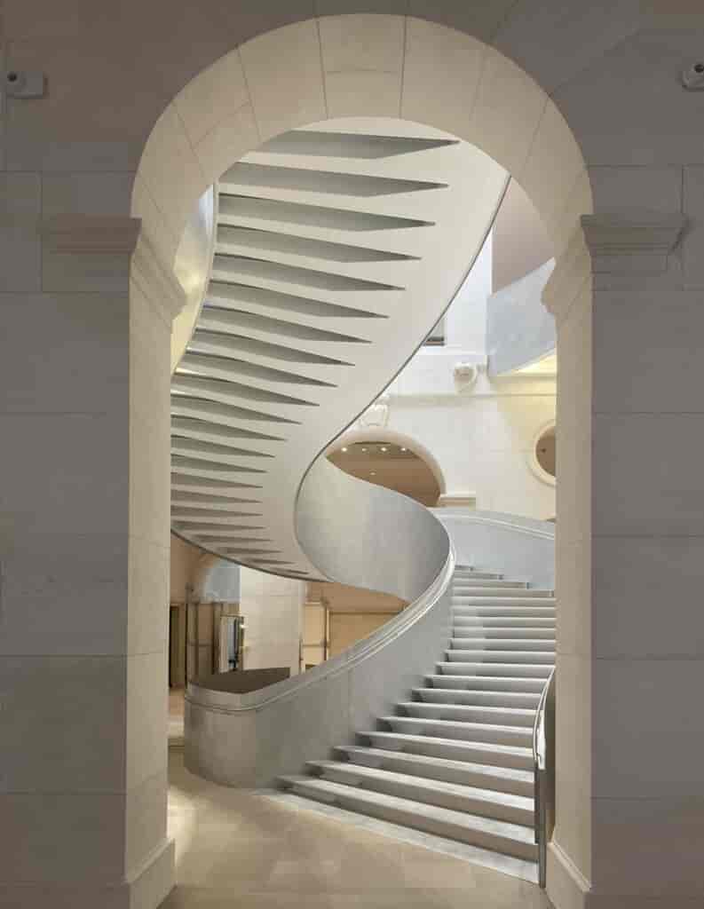 Yapıda bulunan heykel görünümlü alüminyum kaplı sarmal merdiven, kütüphanenin tarihi dokususunu bozmadan mekanlar arası ilişkiyi güçlendiriyor ve büyük salonun etrafında konumlanarak bir doğu-batı ekseni oluşturuyor.