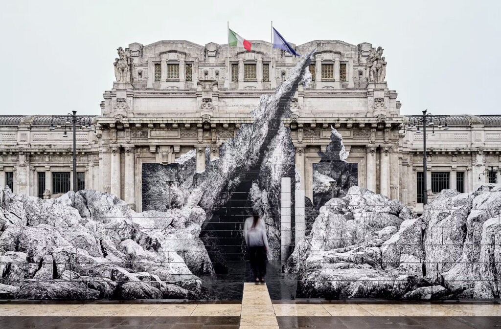 JR’ın ‘La Nascita’sı, Milano Merkez İstasyonu yönetiminin istasyonun cephesini ve Piazza Duca d’Aosta meydanını bir kaya manzarasına dönüştürmek için davet etmesinin ardından ortaya çıkmıştır. Sanat eseri, Kral Victor Emmanuel III’ün 1906’da Simplon Tüneli’nin açılmasının ardından yeni merkezi tren istasyonu için sembolik bir temel taşı koymasıyla istasyonun tarihini anlatıyor.
