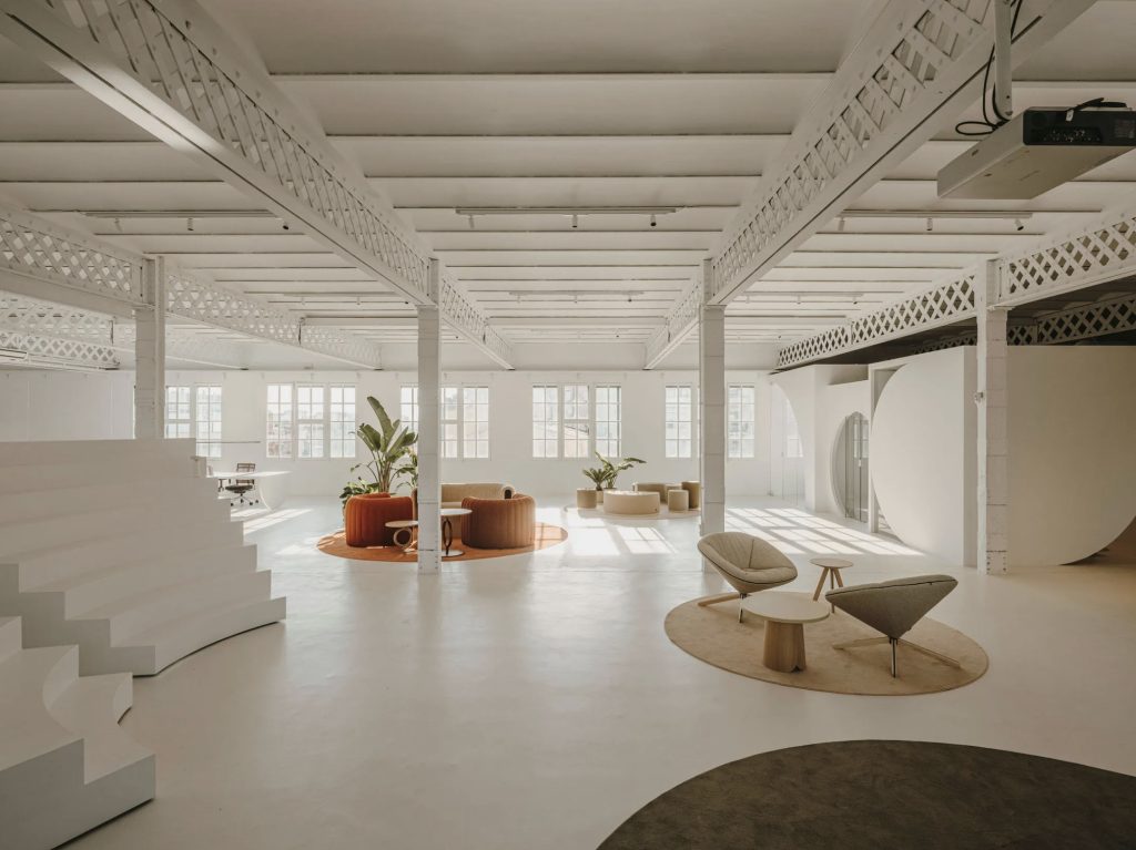 Stratejik ve yaratıcı bir reklam ajansı olan Fuego Camina Conmigo’nun Barselona’da bulunan ofisi, tasarım stüdyosu Isern Serra tarafından açık ve dinamik ofis mekanına dönüştürüldü. Günümüzde sıklıkla karşımıza çıkan ‘açık ofis’ kurgusunu geometrik formlarla birleştiren tasarım, kapalı alanlarda kullandığı mikro mimari strateji doğrultusunda birbirleriyle etkileşime giren ve heykelsi bir geçit oluşturan iç mekana sahip. Aynı zamanda mobilya markası Sancal için bir teşhir salonu olarak da kullanılan ofis, beyaz duvarlar ve ‘ay’ı anımsatan formların arasında renkli mobilyaları gözler önüne seriyor.