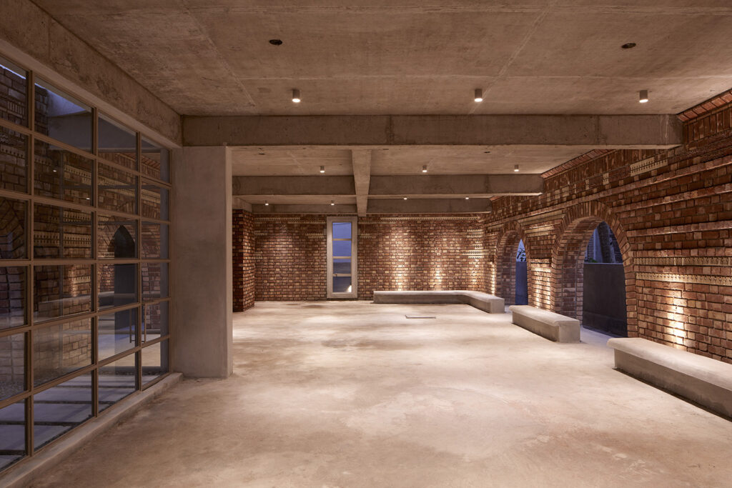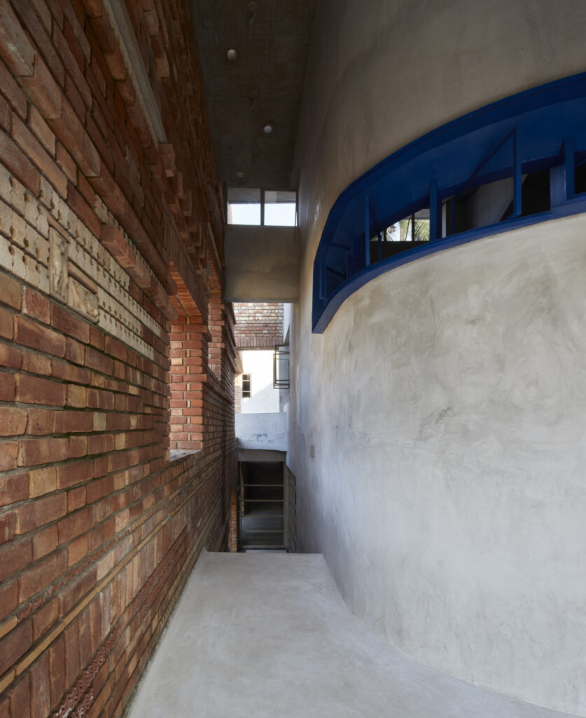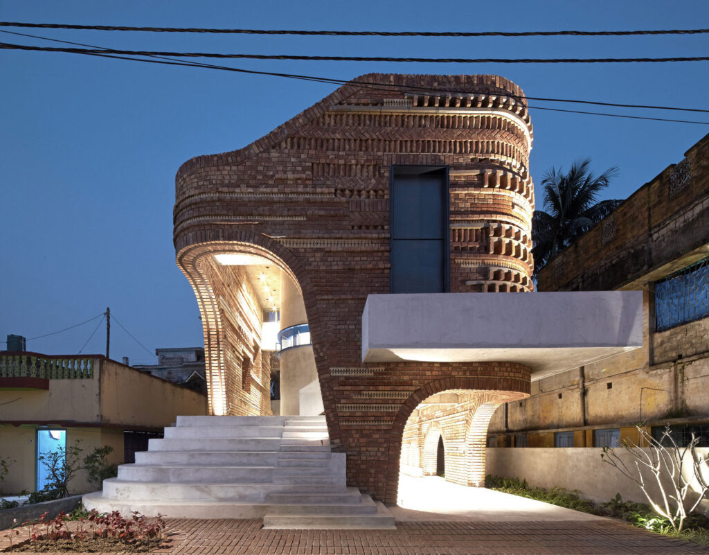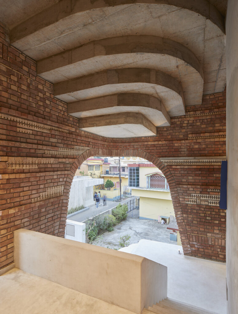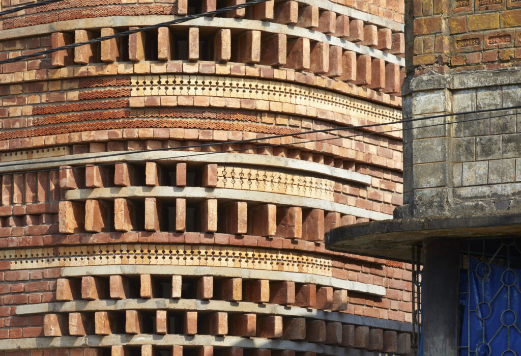 Seramik bloklarla harmanlanan çıplak tuğla duvarlar ilhamını Bengal’in pişmiş toprak tapınaklarından alıyor. Proje için bir seramik sanatçısı ile iş birliği yapılarak endüstriyel amaç için üretilen ve kullanılmayan parçalar toplandı. Terakota tuğlalar ise yakınlardaki bir tuğla alanından temin edildi. İki malzeme yerel duvarcılık ustalığı ile birleştirildi ve ortaya bölgenin simgesi haline gelen oldukça etkileyici bir cephe çıktı.