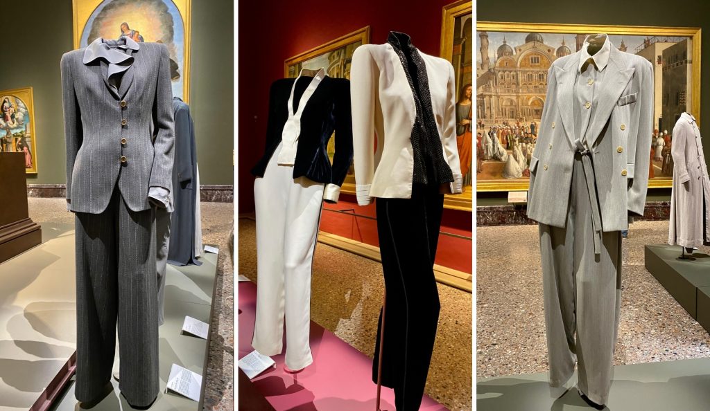 Serginin önemli parçalarından biri de Armani’nin ün kazandığı takım elbiseleri. Yumuşak omuzlara, astarsız yapılara ve hafif kumaşlara sahip bu tasarımlar, klasik takım elbisenin sertliğini kırarak rahat bir zarafet sunuyor.