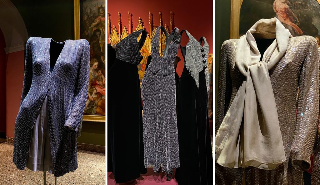Sergide dikkat çeken parçalardan biri, Armani’nin ışıltılı tasarımları oluyor. Payetli elbiseler, altın detaylı ceketler ve tül kumaştan zarif üstler gibi zengin işleme ve parlaklık içeren parçalar, koleksiyonun gösterişli yanını ortaya koyuyor.