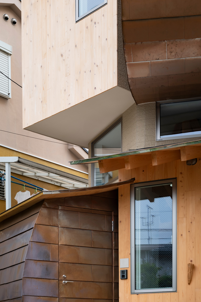 Yapının cephesi, çevredeki ağaçların organik formlarına yanıt veren düz ve kavisli yüzeylerin birleşiminden oluşuyor. Zamanla karakter kazanan bakır ve Japon selvisinden oluşan cephe malzemeleri, yapının doğayla uyumlu biçimde yaşlanmasını sağlıyor. Bakır paneller, geleneksel ‘ichimonji-buki’ deseninde yerleştirilirken; Japon selvisi, farklı yönlerde uygulanan dikey kaplamalarla yüzeye ritim kazandırıyor. Paslanmaz çelikten yapılmış kavisli çatı ise tüm bu unsurları bütünleştirerek yapıya akıcı bir siluet kazandırıyor. Bu uygulamalarla yapıda, tek bir baskın ifade yaratmak yerine belirsizliği, değişimi ve hayal gücünü davet eden bir görünüm oluşturmak amaçlanıyor.