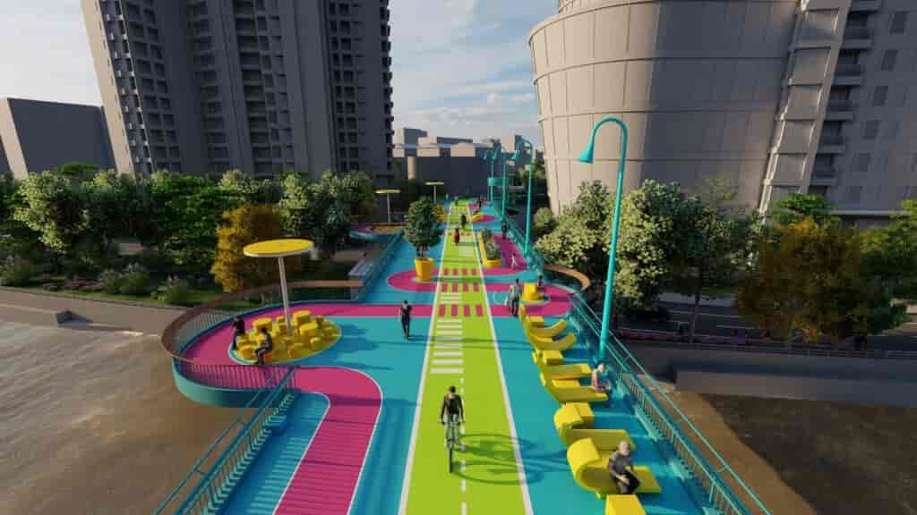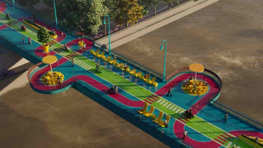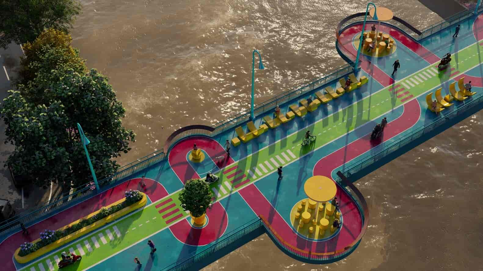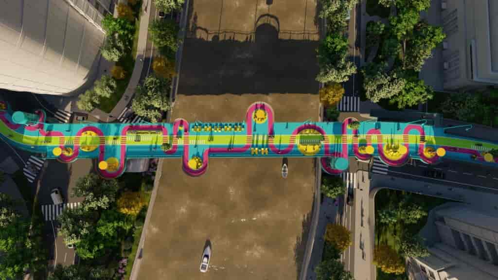 Tasarım, mevcut yapıyı değiştirmeden, üstüne farklı renklerden oluşan bir katman ekleyerek onu dönüştürüyor. Bu sayede köprünün işlevsel özellikleri geliştirilirken sirkülasyon sistemi de düzenlenmiştir.