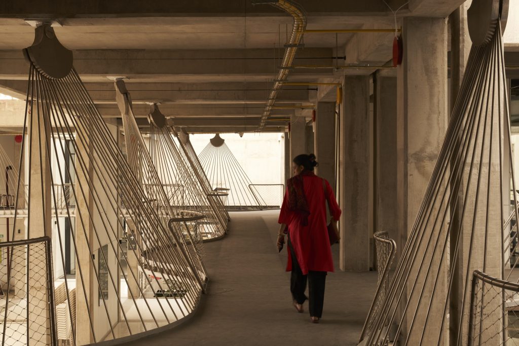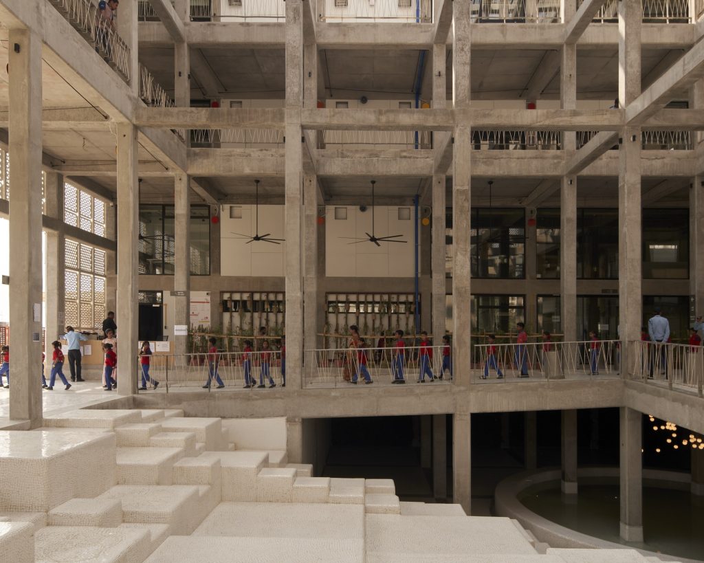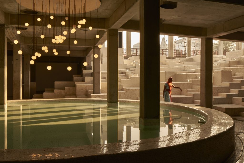 Merkezin girişinde, Rajasthan’ın ünlü basamaklı kuyularından (Baori) esinlenerek tasarlanmış büyük bir atriyum yer alıyor. Bu alan, kafe ve mağazayla çevrelenmiş, oturma ve sosyalleşme alanı olarak hizmet veriyor. Atriyumdan geçilerek ulaşılan zemin kat ise esnek sergi ve performans alanı olarak tasarlanmış. İç mekânda bu tür açık ve ortak alanlar, atölye çalışmaları ve etkinlikler için daha bölümlere ayrılmış odalarla dengelenmiş.