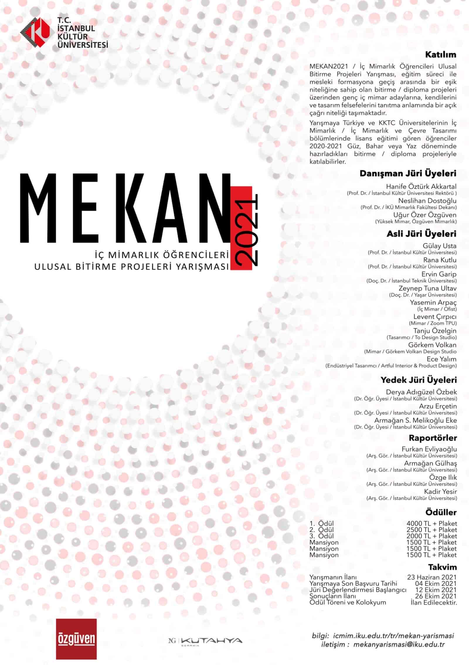 İstanbul Kültür Üniversitesi İç Mimarlık ve Çevre Tasarımı Bölümü tarafından 8. kez düzenlenen “İç Mimarlık Öğrencileri Ulusal Bitirme Projeleri Yarışması”na proje teslim tarihi 4 Ekim 2021.