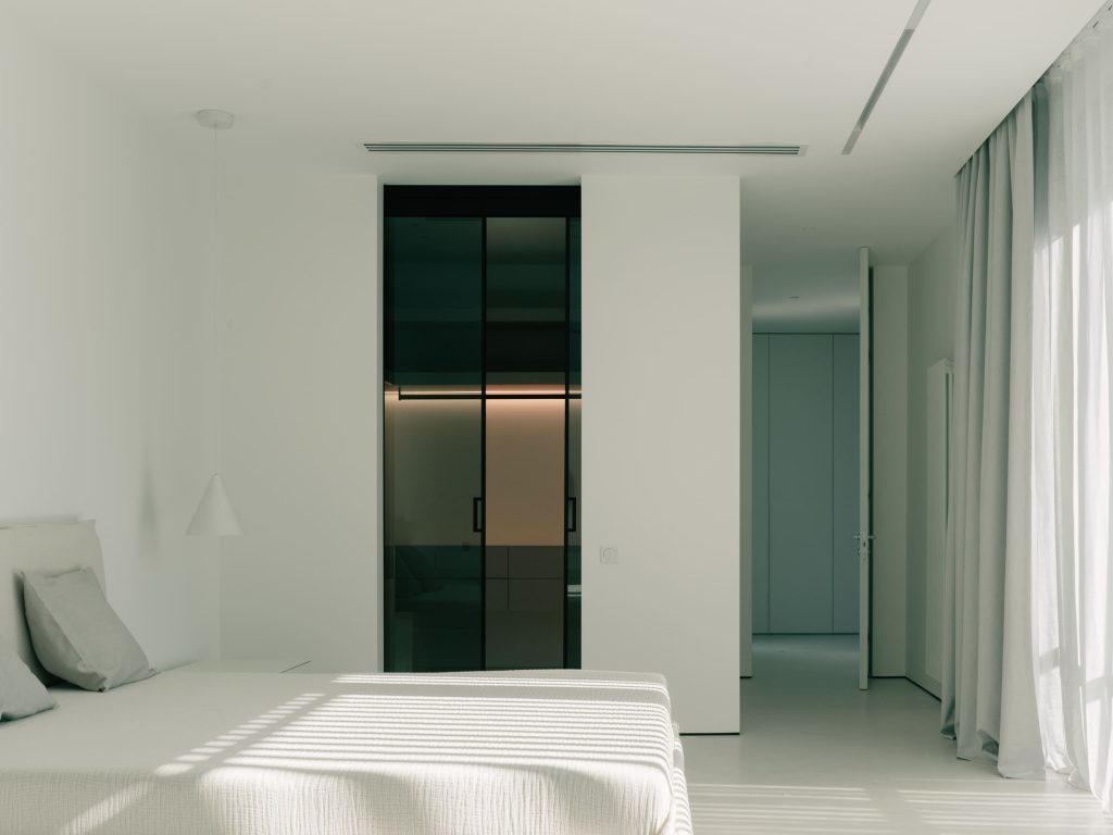 Ev içinde dolaşım, avlunun sürekli referans noktası olduğu, çevre boyunca yavaşça yükselen bir sekans hissi veriyor; böylece içe dönük kurgu kapalı bir şema olmaktan çıkarak dinamik bir mekânsal akışa dönüşüyor.