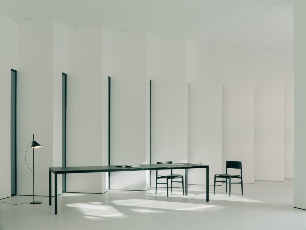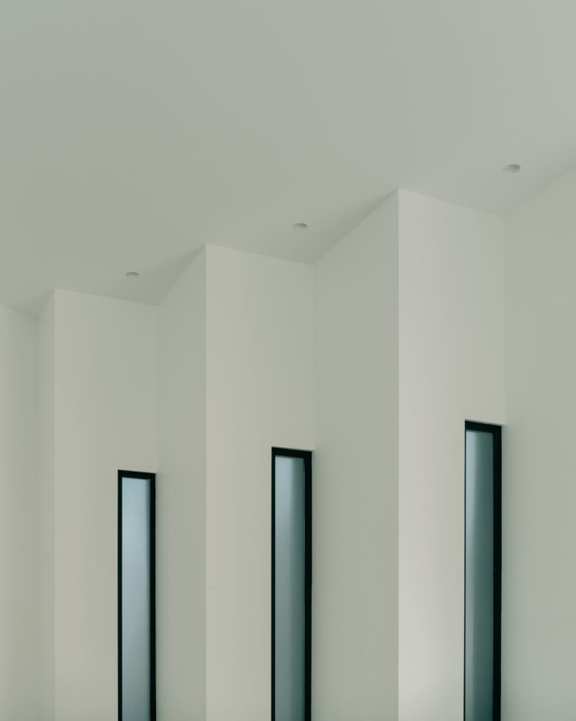 Yapı kütlesi arka tarafta üç kata yükselirken, caddeye bakan cephede tek katlı bir hacim olarak algılanıyor. Bu kesitsel farklılık, çift kat yüksekliğinde yaşam alanları ve yarım katlarla kademeli, akıcı bir mekânsal deneyim yaratıyor.