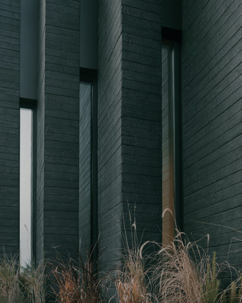 Malzeme kullanımı, projenin iç ve dış mekânlar arasındaki tersine çevrilmiş ilişkiyi görünür kılacak nitelikte. Sokağa bakan yüzeylerde, ahşabı hava koşullarına karşı korumak için tercih edilen kömürleşmiş ahşap ile yoğun ve koruyucu bir dış kabuk oluşturulmuş; avluda ise bu koyu ve sert kabuk yerini doğal, işlenmemiş ahşaba bırakıyor. İç mekânda ise renk paleti olarak bu ters ilişkiyi vurgulamak için dış cephe ile kontrast oluşturan beyaz ve tonları tercih edilmiş.