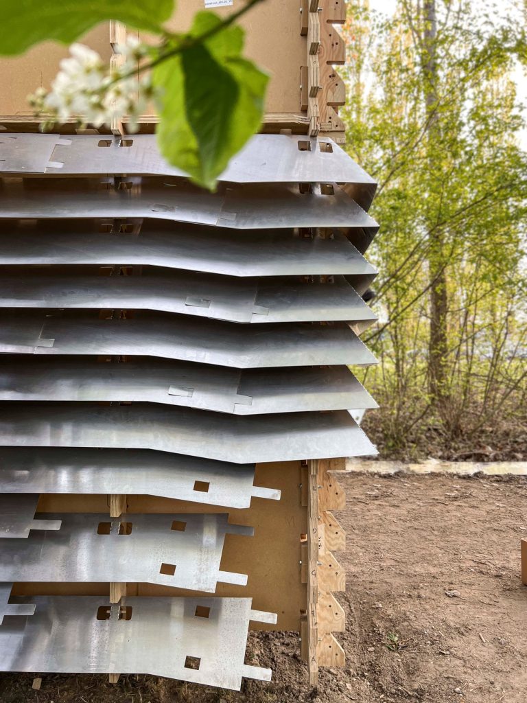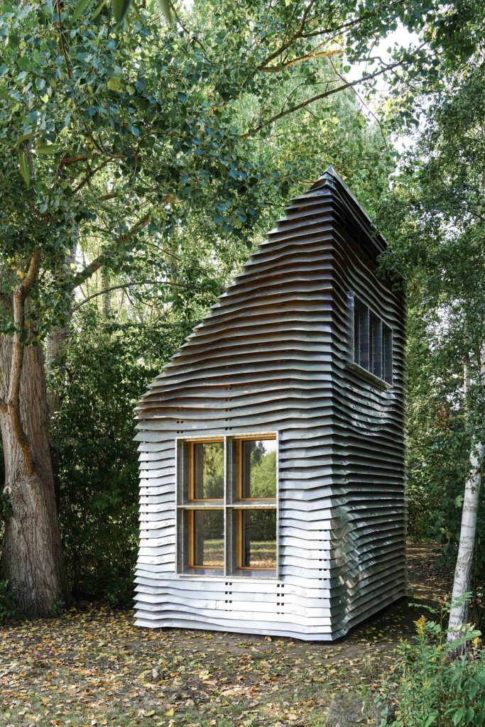 Şeritler, ana yapıdaki lazerle kesilmiş bölümlere geçirilir ve evin dış çevresinde bir dalgalanma deseni oluşturmak için yığılırlar, bu sırada doğal ahşap elyaf yalıtım malzemesi, yapı ile metal cepheler arasındaki boşluğu doldurur. Mimarların açıklamasına göre cephe için geri dönüştürülmüş alüminyum levhalar kullanmak ‘önemli derecede enerji tasarrufu ve sera gazı emisyonlarında azalma’ sağlayan bir tercih olmuş.