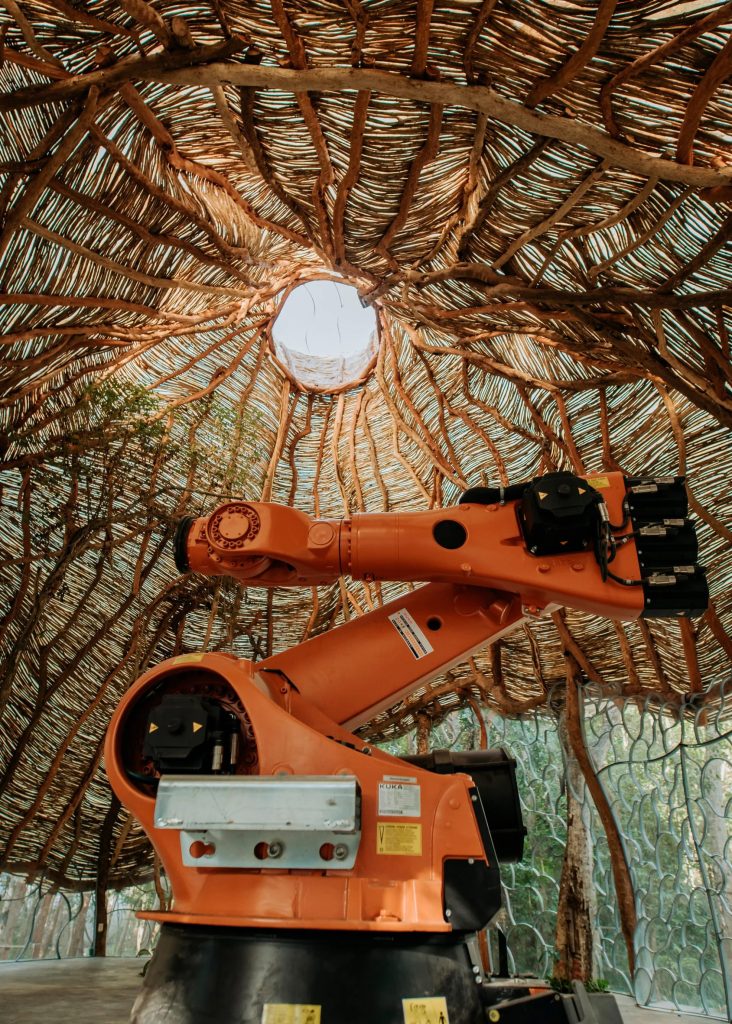 3D yazıcılar, termoform makineları, lazer kesiciler, su jetleri ve altı eksenli robotik kol gibi makineleri barındırmak üzere oluşturulan iç mekan, değişen yüksekliklere sahip alanlardan oluşur. İç mekanda aynı zamanda yapının bir uzantısı olarak tasarlanan organik formlu banklar ve saksılar yer alır. İç mekanın karakterini oluşturan galeri boşluklarından yer yer ağaç gövdeleri yükselmektedir. Büyük robotun bulunduğu başka bir galeri boşluğu ise örülmüş ahşap kalıntıları ve sarmaşıklardan meydana gelen kubbesiyle dikkat çeker.