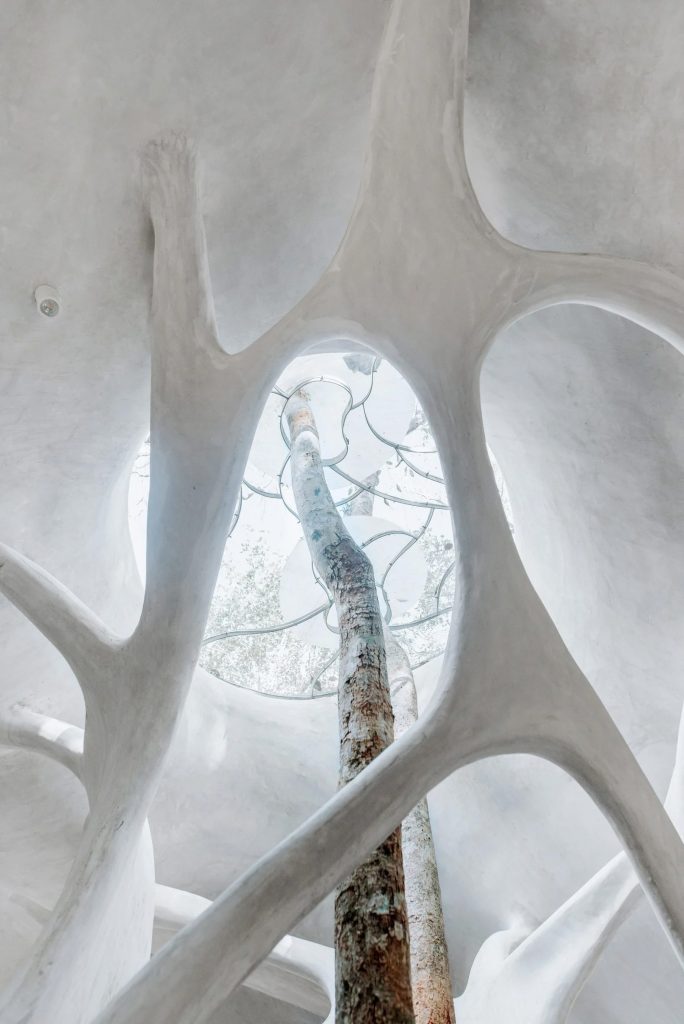 Kavisli pencereler ve sıra dışı formlardaki kapılar, metal çerçeveler ile sabitlenerek düzensiz bir şekilde farklı yüksekliklere yerleştirilmiştir. Bazıları doğrudan zemine temas eden transparan yüzeylerin bazıları ise pencere olarak görev yapmaktadır. Stüdyo bu alışılagelmemiş mimari elemanların ‘ağaç yapraklarına ve böcek kanatlarına atıfta bulunduklarını’ belirtiyor. Pencerelerin bir kısmı reçine ve palmiye lifleri ile kaplanarak doğa ile olan ilişkiyi doğrudan malzeme boyutuna da taşıyor.