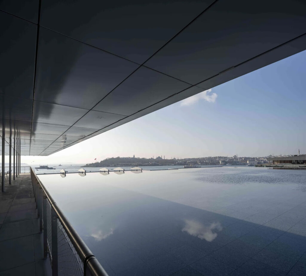 Şeffaflığı ön planda tutan zemin kat, Tophane Parkı ve kıyı şeridi arasındaki ilişkiyi güçlendiriyor. Önündeki kamusal alanın müze ile kurduğu ilişki de Renzo Piano’nun diğer müze binalarında görmeye alışık olduğumuz türden bir diyalog vadediyor. Şeffaflık hissiyatı binanın diğer katlarında da yer yer devam ederek ziyaretçilerin çevre ile sürekli bir görsel etkileşim içerisinde olmasına olanak tanıyor. Kafe, müze mağazası, kütüphane, bilgilendirme noktaları ve eğitim atölyeleri için ayrılan mekanlar zemin katta lobiyi çevreleyecek şekilde konumlandırılıyor. Eski binasında da eşsiz manzarasıyla öne çıkan müze restoranı, bu kez de birinci katta şanına yaraşır bir Boğaz ve Tarihi Yarımada manzarasına doğru yönlenmiş olarak karşımıza çıkıyor. Aynı katta fotoğraf galerisi, kısa süreli sergi salonu, eğitim ve etkinlik alanları da yer alıyor. İkinci kat ise müze koleksiyonuna ve süreli sergi salonlarına ev sahipliği yapıyor. Binanın terasına gelindiğinde ziyaretçilere benzersiz bir seyir deneyimi sunuluyor. Çatıyı tamamen kaplayan sığ havuz, kentin su üzerine yansıyan görüntüsünü ve denizi bütünsel bir algı yaratacak şekilde gözler önüne seriyor.