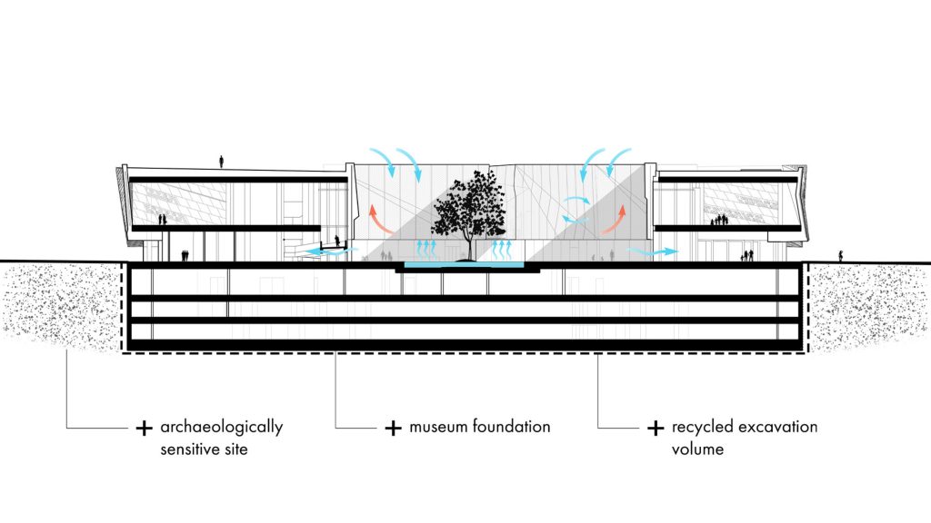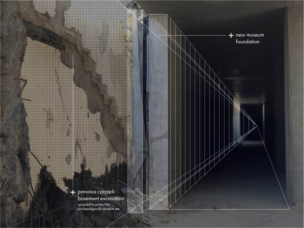 Masif bir kütleden oyulmuş izlenimini veren müze binası, yakınındaki surlarla hiyerarşik bir yarışa girmeyen yatay bir forma sahip. Yapı, kara duvarlarını ve ulaşım merkezini takip eden rotayla ilişkilenerek sarmal bir kurguyla şekilleniyor. Kütle, bulunduğu yerin topografyasına bağlantı kuran bir yaya köprüsü ile bölünerek giriş noktasını belirgin hale getiriyor.