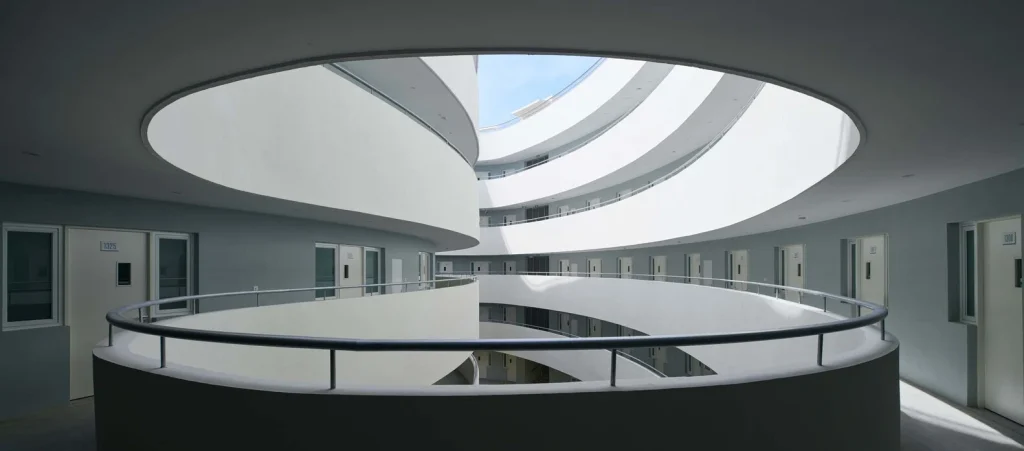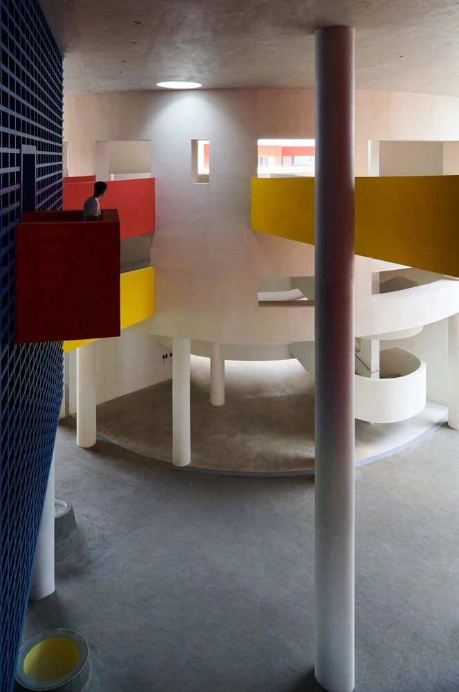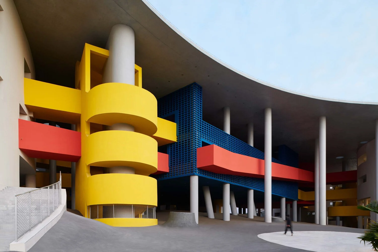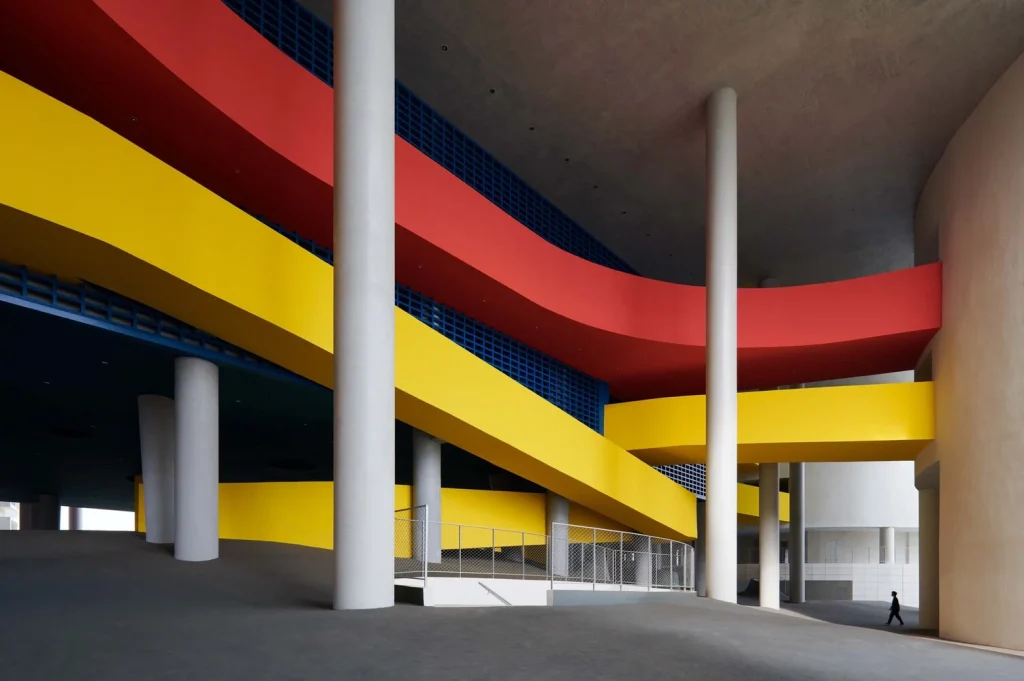 Konsol hacimler ve çift yükseklikli kolonlar, beton çatı altında tropikal iklim için uygun yarı dış mekanlarda dinamik bir sıralamayla kurgulanmıştır. Farklı yüksekliklerdeki köprüler ve rampalar, katı asılı hacimlerle birbirine bağlanır. Mavi küp ve kırmızı silindirik blok sırasıyla çok amaçlı etkinlik salonu ve sergi salonuna ev sahipliği yapmaktadır.