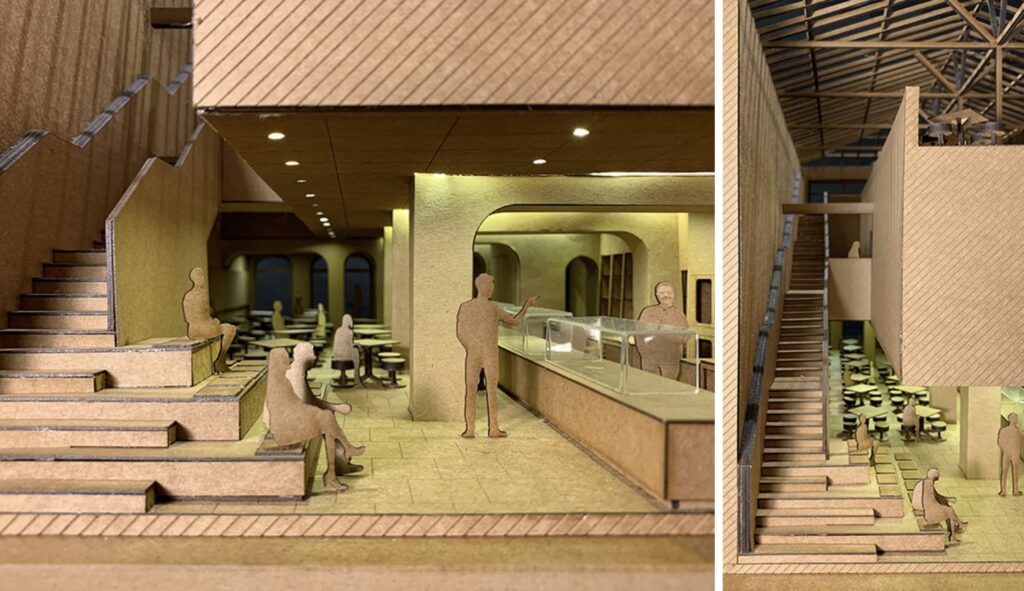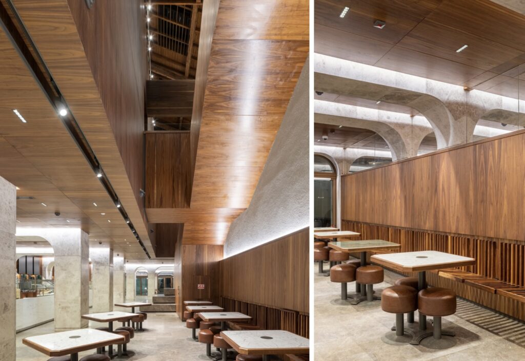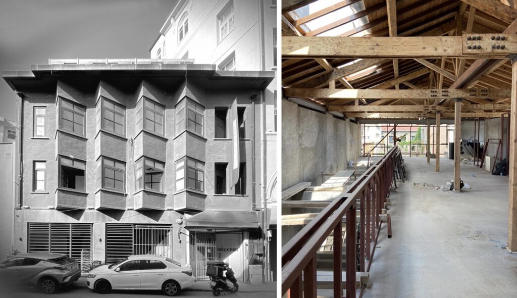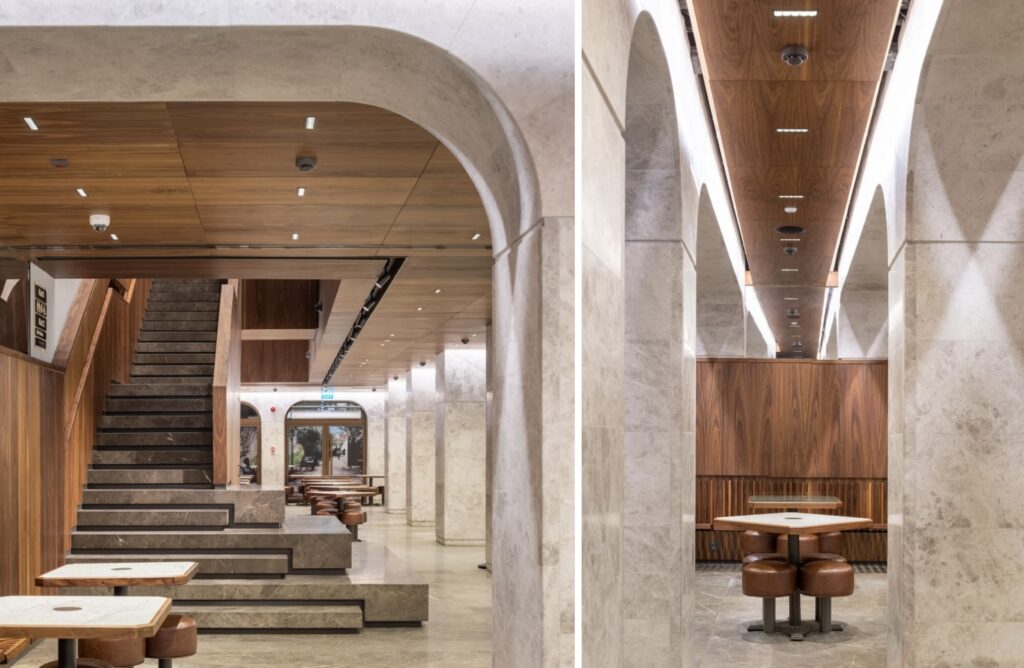 Mekanda tekrar eden kemerler, tekdüze perspektifini kırıyor ve dinamik bir mekan yaratıyor. Böylelikle, ince uzun hacmin basık atmosferi kemerlerin sonsuza uzandığı yansımalarda genişliyor. 40 metreyi aşan bina derinliği kademelendirilerek alt mekanlar elde ediliyor. Aynı zamanda, iki farklı yapının zaman içinde tadilat ve güçlendirmelerle bozulan strüktürel sistemine bütüncül bir yorum getirilmiş.