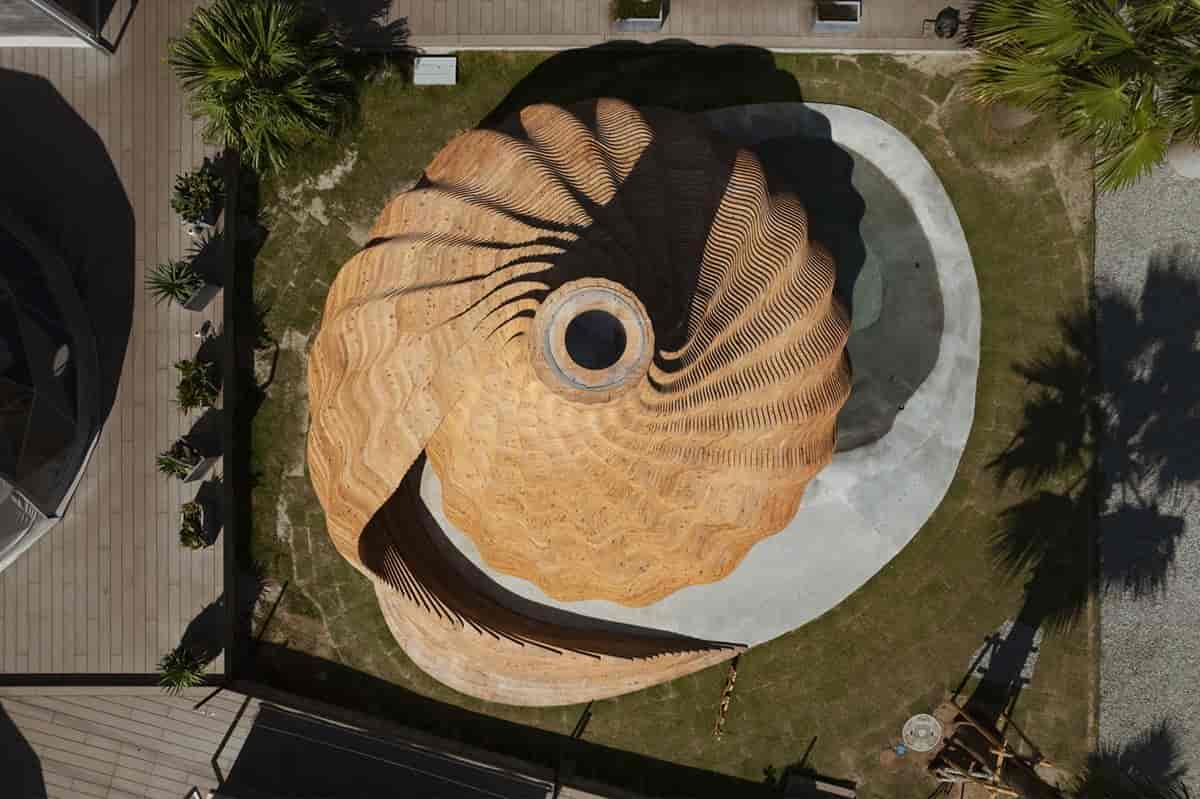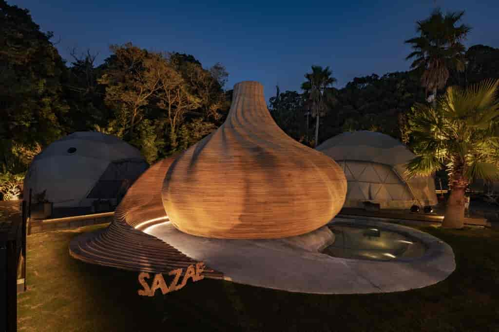 Japonya’nın Naoshima kentindeki SANA MANE Glamping tesisleri içinde yer alan Kengo Kuma & Associates imzalı ahşap sauna SAZAE’nin inşaatı tamamlandı. Sauna yapısı beton bir taban üzerine yerleştirilmiş kıvrımlı ahşap bir cepheye sahip. Deniz kabuğunu andıran yapıda giriş için organik formun bitiminde oluşturulan açıklık kullanılıyor. Biyomimetik tasarım yaklaşımına örnek sayılabilecek projede tek bir açıklıktan süzülerek içeriye giren güneş ışığının mekanda yarattığı etki dikkat çekiyor. Pürüzlü ahşap yüzeylerde ışık ve gölge oyunları mekanın meditatif etkisini artıran ana unsurlardan.