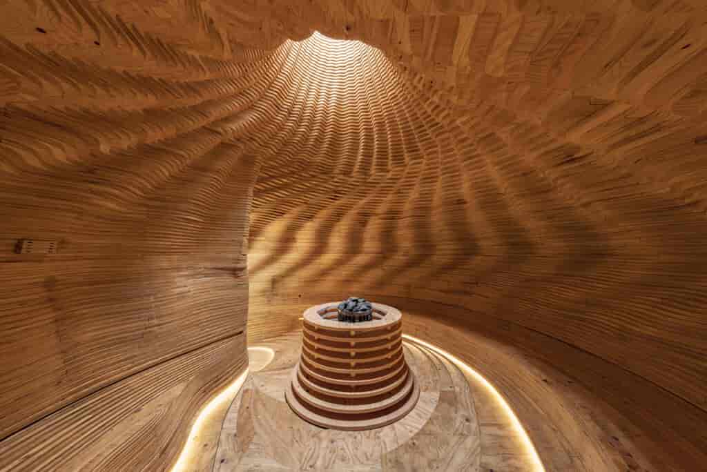 Kıvrımlı formu yaratmak için Kengo Kuma & Associates ekibi, TTNE ve yapısal mühendislerle birlikte bir dizi dijital simülasyon oluşturdu. Sauna için pek de alışılmadık olan yüksek tavan, üstten alta doğru kurgulanan teknolojik bir havalandırma sistemiyle çözümlendi ve iç mekanın ısıl konforu sağlandı.