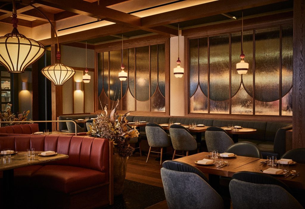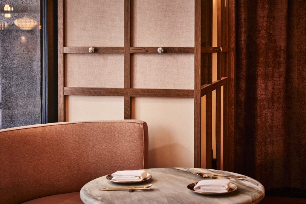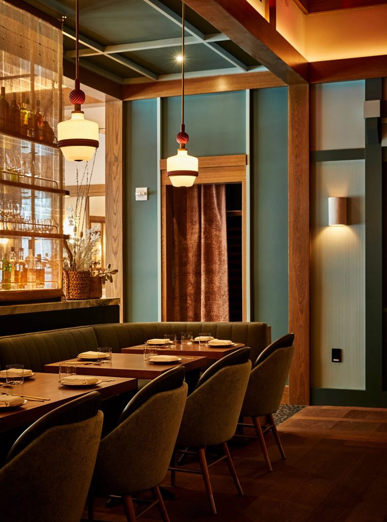 Ceviz ve mermer masa tablaları, duvarlarda ve döşemelerde deniz mavisi ve bordo paletine eşlik ediyor. Yüksek tavanların altındaki aynalı ve renkli metal paneller mekâna derinlik katıyor. Özel aydınlatmalar, Kore mücevherlerinin şekil ve dokularını ve binyeo adı verilen dekoratif saç tokalarını anımsatıyor. Bu tasarım dili, masaların üzerinde asılı duran sarkıtlar, boncuk benzeri aplikler ve avizelerde görülüyor.