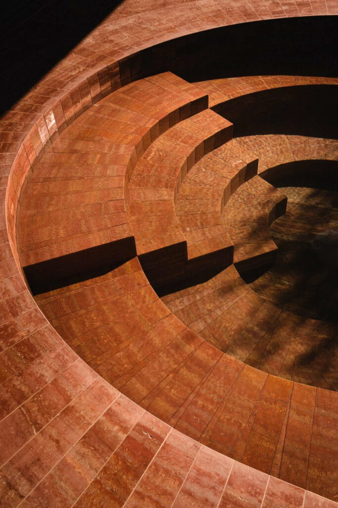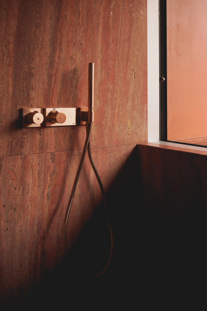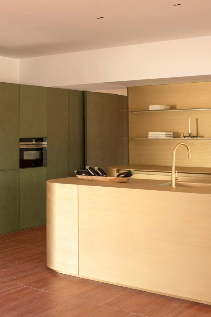 Çakıllı bir avlunun ortasından uzanan uzun yüzme havuzu sakin atmosfere uygun bir şekilde eve eklemlenir. Havuz, ana binaya doğru uzanırken, çatısı yuvarlak bir açıklığa sahip bir çıkma ile buluşarak kavis yapar. Geniş cam kapı, bu çıkmayı yaşam alanından ayırır. Bu alan, yemek mekanı ve yeşil tonlu dolapları ve pirinç yüzeyleriyle öne çıkan mutfak ile devam eder.