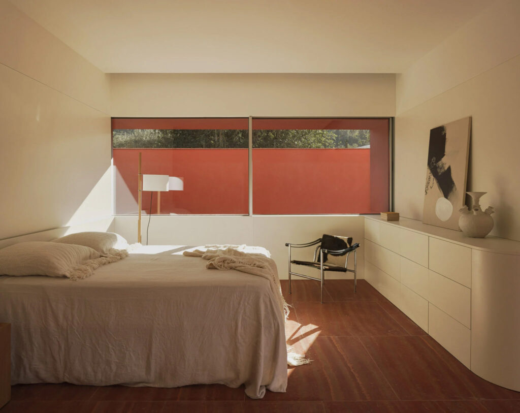 Ev boyunca, dış mekanın toprak renkli dokusuna atıfta bulunan kırmızı duvarlar yer almaktadır. Bunlar arasında terakota tonlarındaki zeminler ve banyolar ile iç mekandaki havuzda tercih edilen İran traverteninden yüzeyler de bulunur. Ana yaşam alanından iki adet özel banyolu yatak odası ayrılır ve çevredeki zeytin ağaçlarının manzarasını çerçeveleyen özel avlulara açılır. Evin önemli unsurlarından olan avlular, zeytin ağaçları ve geniş arazinin yaşam alanının bir parçası haline gelmesinde etkili olur. La Casa de los Olivos, karakteristik rengi, zeytin ağaçların arasına yerleşen hacmi ve etkileyici bir doğanın tam ortasındaki heykelsi varlığı ile çevresinin özgün bir elemanı ve devamı haline gelmeyi başarır.