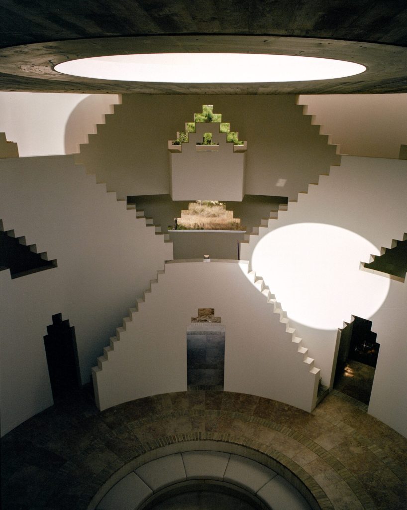 Kulenin iç mekanı, ziyaretçileri merkezi bir oturma ünitesi, şömine ve onları çevreleyen çapraz merdivenlerle karşılıyor. Pantheon gibi tarihi tapınakların mimari planlarında karşımıza çıkan ‘oculus’u andıran tavandaki dairesel açıklık, iç mekanın doğal aydınlatmasını sağlıyor.