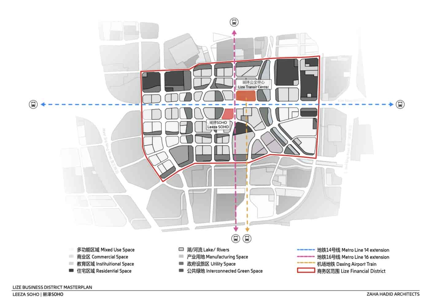 Leeza Soho’nun atriyumunun en düşük seviyesi, iş bölgesi için halka açık bir meydan olarak tasarlanmış ve kulenin içindeki tüm alanları birbirine bağlayan, bükümlü ve heykelsi şekli nedeniyle değişen manzaralar sunan halka açık bir meydan görevi görüyor. Pekin için, doğrudan şehrin ulaşım ağına bağlı olan fantastik bir yeni kamusal alan yaratıyor.