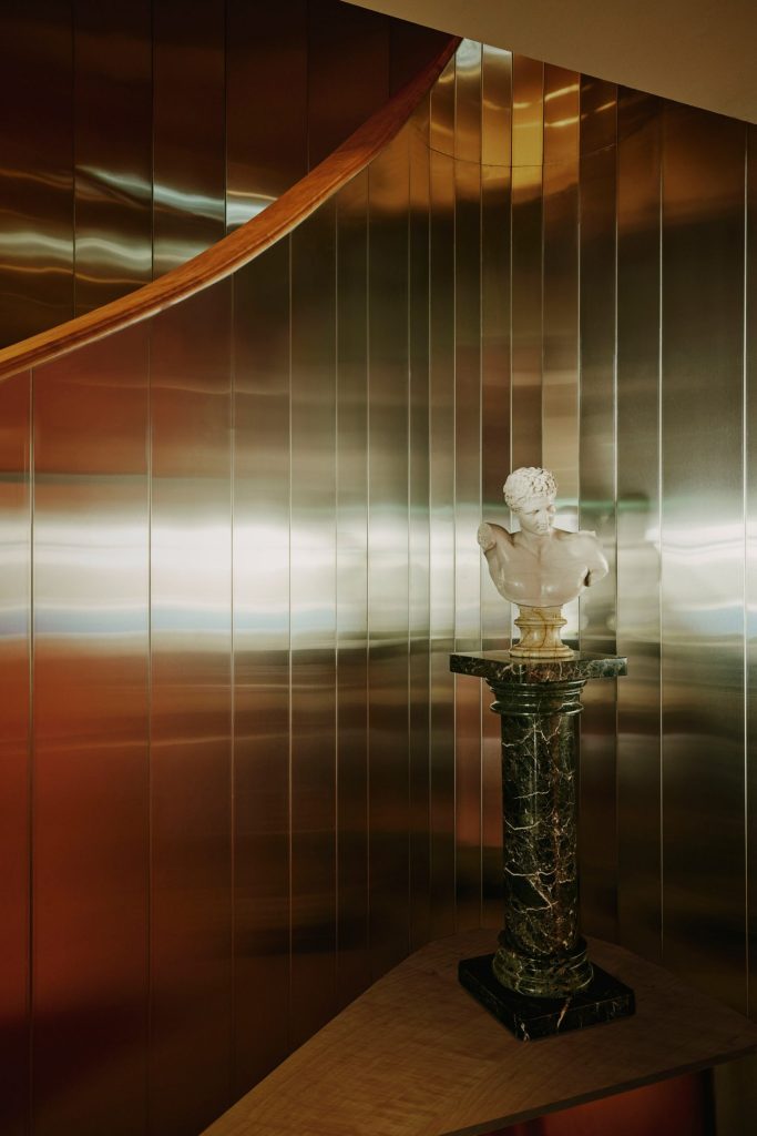 Alt kattaki resepsiyon alanı, kadife perdeler ve mermer detaylarla teatral bir karşılama sunuyor. Tavandan tabana uzanan pencereler, doğal ışığı iç mekâna taşırken paslanmaz çelik, mikro çimento ve kadife gibi malzemelerin dengeli birleşimi mekâna derinlik katıyor.