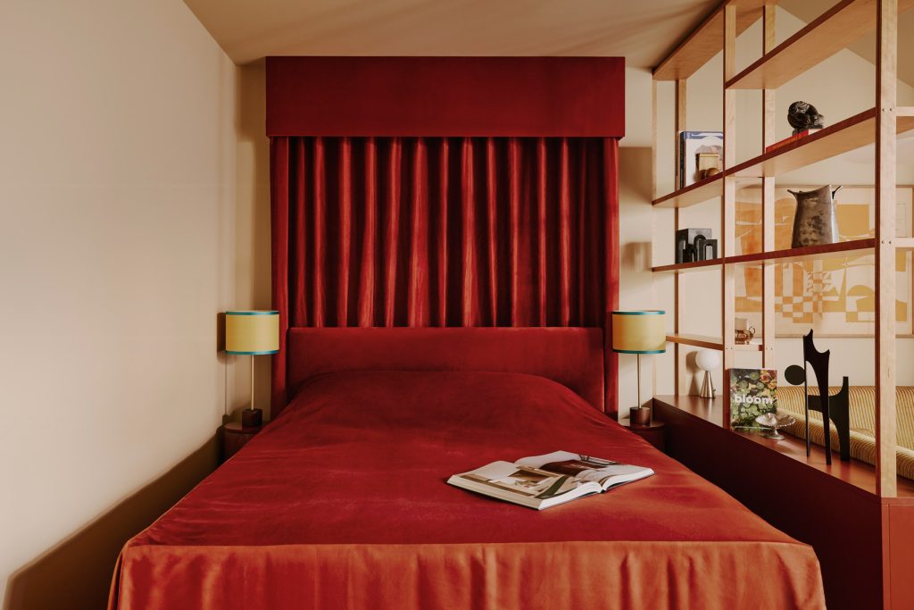 Sıcak kırmızı ve sarı tonları, güçlü desenleri ve zengin döşemeleriyle odalar, geleneksel olarak bir kadının özel yaşam alanını ifade eden boudoir stilinde tasarlanmış. Duvarları kaplayan ısmarlama perdeler, yatakları çevreleyerek sıcak ve davetkâr bir atmosfer yaratıyor. Stüdyolarda ise tam donanımlı mutfaklar ve oturma alanları, misafirlere ev konforunu hissettiriyor.