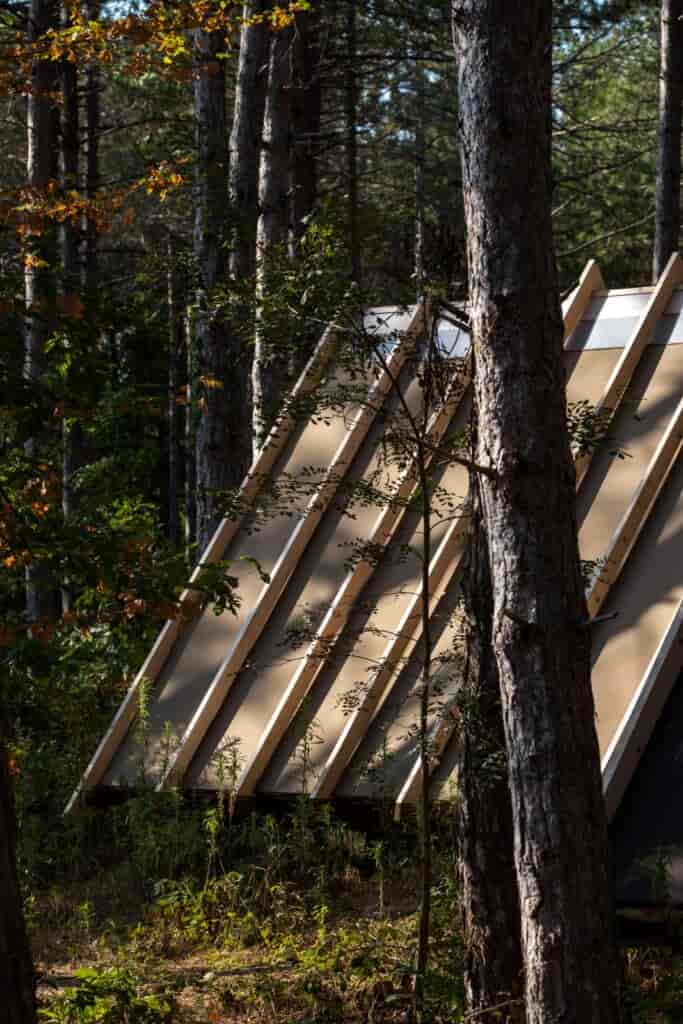 Projede yer alan farklı büyüklükteki her birim aslında birbirinin varyasyonu olarak düşünülmüş. Ölçek ve form değişse de strüktürel sistem ve malzeme paletleri sabit tutulmuş. Her ünite ahşap nervürlerden oluşan bir çerçeve ile sarılmış ve yük taşıyıcı ikincil ahşap sistem bu çerçeveye ters yönde çalışacak şekilde yerleştirilmiş. Bu tercih hem inşaat sürecini kolaylaştırmış hem de oldukça yalın bir atmosfer oluşmasına olanak sağlamış. Doğal zemin ve bitki örtüsü üzerinde minimum hasar bırakmak adına da her birim destekler üzerinde yükseltilerek inşa edilmiş.