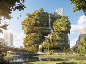 Alanın en büyük bölümü ise batıda konumlandırılan yaprak formunun içerisinde bulunuyor. Bu bölüm konaklama hizmetini kullanacak ziyaretçiler için tasarlanmıştır. Bölgenin ortasında yer alan biyolojik göl ziyaretçilerin deneyimini daha keyifli hale getiren bir unsur olarak karşımıza çıkıyor. Gölün etrafında glamping çadırlarından kabinlere kadar birçok farklı tipte konaklama imkanı oluşturulmuş. Glamping açıklamasındaki konfor düşüncesini destekler nitelikte bu bölüm içerisinde bir de lobi, kafe, spa ve toplantı salonu tasarlanmış.