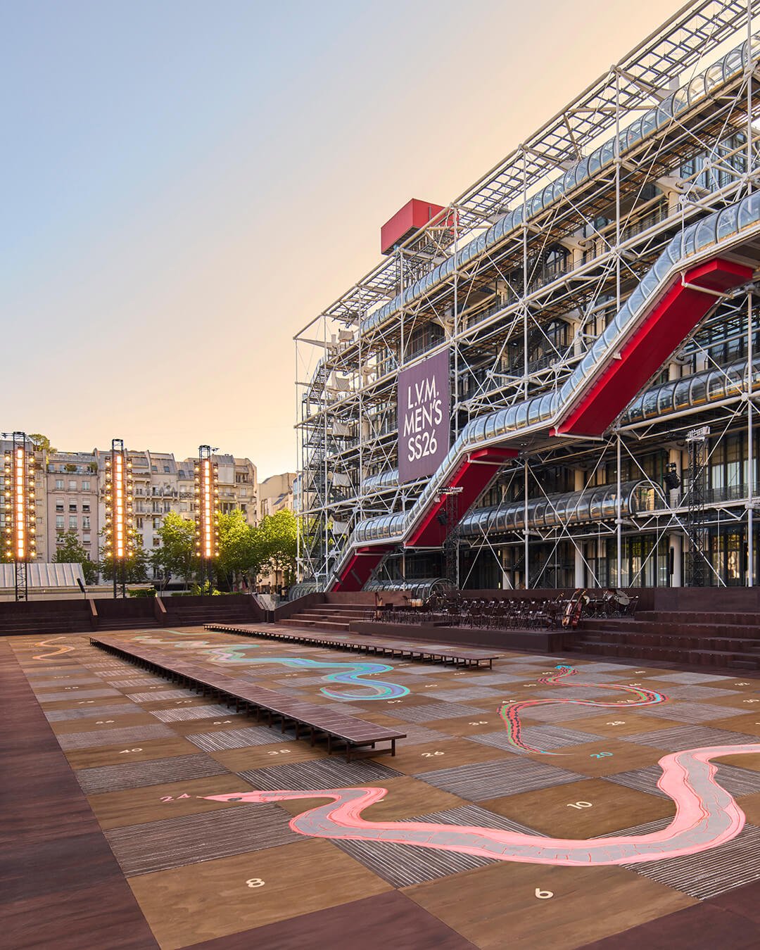 Paris’teki Centre Pompidou’nun ön avlusunda, 18 Haziran 2025 tarihinde gerçekleşen Louis Vuitton 2026 İlkbahar/Yaz erkek giyim defilesi, modayı mimarlıkla, oyunla ve felsefeyle birleştiren benzersiz bir sahneleme ile izleyicilerin karşısına çıktı. Pharrell Williams’ın direktörlüğünü üstlendiği koleksiyonun sunumu, Hintli mimar Bijoy Jain (Studio Mumbai) ile iş birliği içinde, klasik Snakes and Ladders (Yılanlar ve Merdivenler) oyunundan ilhamla dev bir oyun tahtasına dönüştürüldü. Paris Moda Haftası kapsamında gerçekleşen gösteri, ziyaretçileri yalnızca bir defile izlemeye değil, aynı zamanda dev bir mandalanın içinde adım adım dolaşmaya davet etti.