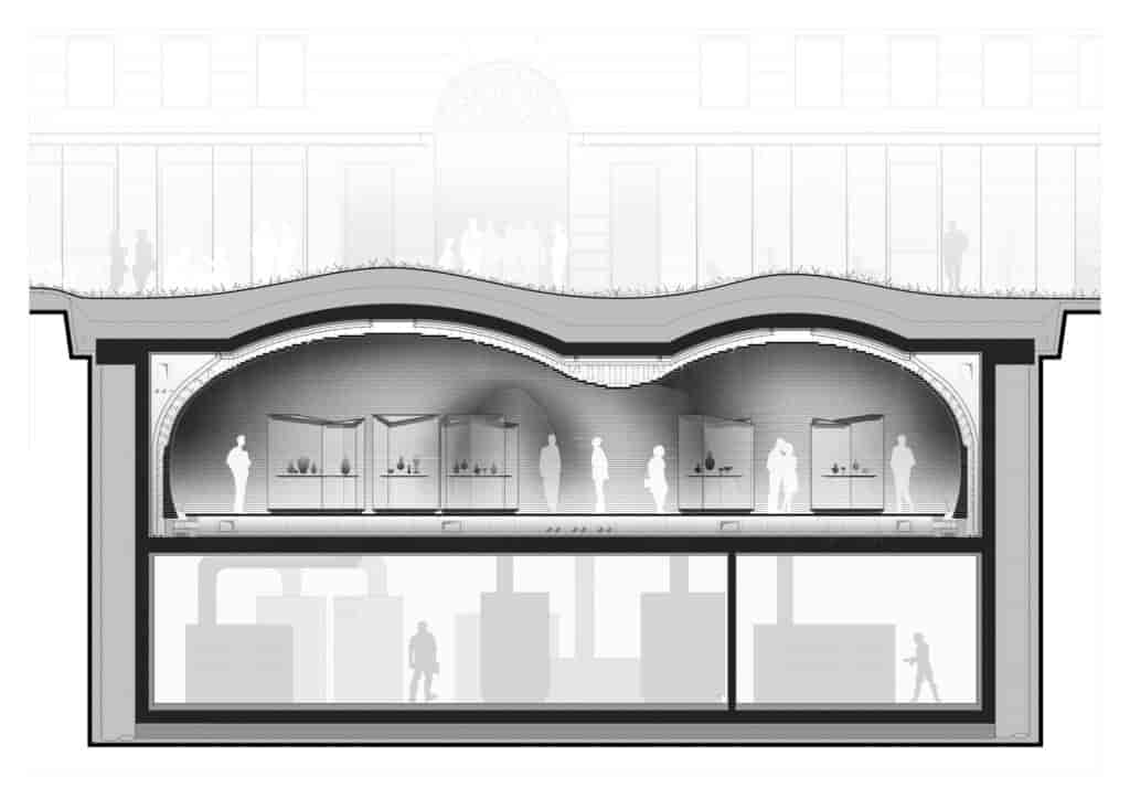 Ana sergi alanının yer aldığı bodrum katı, Cerveteri’nin Etrüsk mezarlarından esinlenilerek tasarlanan dört kubbeli oda boyunca düzenlenmiş mağara benzeri bir form ile çevrelenmiş. Etrüsk uygarlığının gizemli bir atmosferini yansıtan iç mekan, diğer mekanlarla tezatlık gösteriyor.