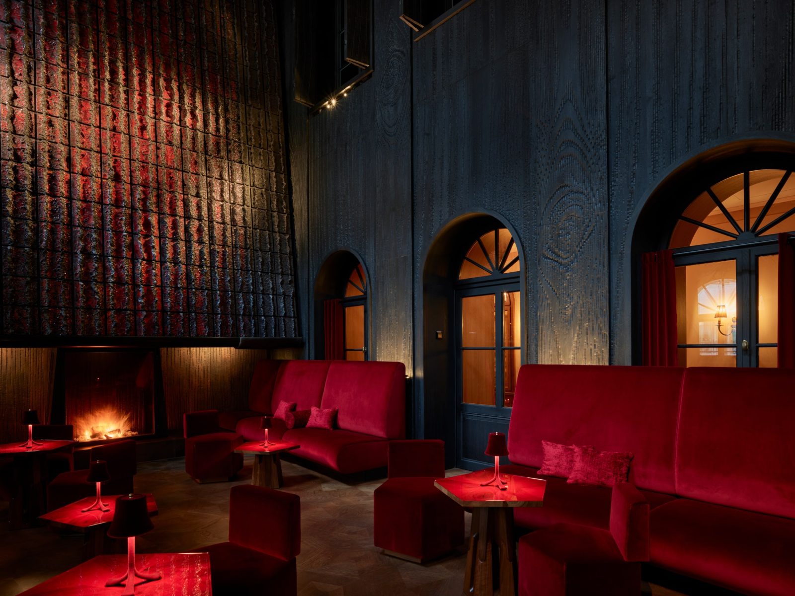 Kırmızı kadife kanepeler, koyu kahverengi ceviz ağacından özel olarak tasarlanmış yedi masa ve tabureye eşlik ediyor. Masalar, Herzog & de Meuron tarafından tasarlanıp Artemide tarafından üretilen ‘Kırmızı Başlıklı Kız (Red Riding Hood)’ lambalarıyla tamamlanmış. Meşe parke zemin ve iki şömine ise odanın sıcak ve davetkâr atmosferini kusursuz bir şekilde tamamlıyor.