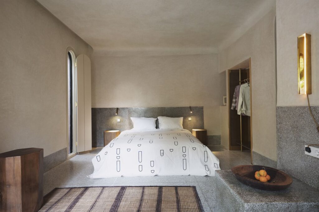 Butik otelin dikey çizgilerden oluşan giriş duvarı, iki kemerli siyah kapısı ile ziyaretçileri bitkilerle dolu bir bahçeye yönlendiriyor.
