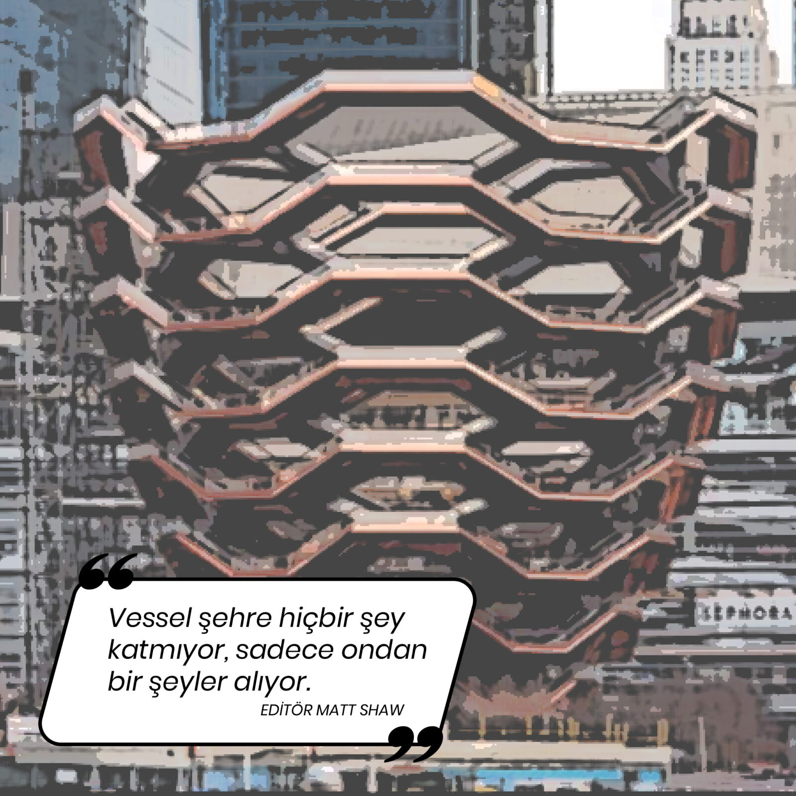 Thomas Heatherwick’in meşhur yapısı Vessel’ın art arda gerçekleşen intihar vakaları nedeniyle kapanmasının üstünden 2 sene geçmesine rağmen yapı halen mimarlık dünyasının gündeminde. Mimarlık yazarı, editör ve küratör Matt Shaw Dezeen’e bu olaylı yapının sorunlarını değerlendirirken ilginç bir benzetmede bulunuyor: ‘Geçen hafta New Jersey’den bir otobüsle New York Şehri’ne Manhattan’ın Batı Yakası’nın silüetini gören bir manzara eşliğinde geldim. Gizemli bir parlama beni rahatsız etti ve gözlerimi ayarladıkça, Vessel’ı tanıdım – Thomas Heatherwick’in Hudson Yards’taki 200 milyon dolarlık merdiveni. Fark ettim ki o görünüm Manhattan’ın giriş kapısı ve Vessel, 21. yüzyılın New York Şehri’nin simgesidir.’