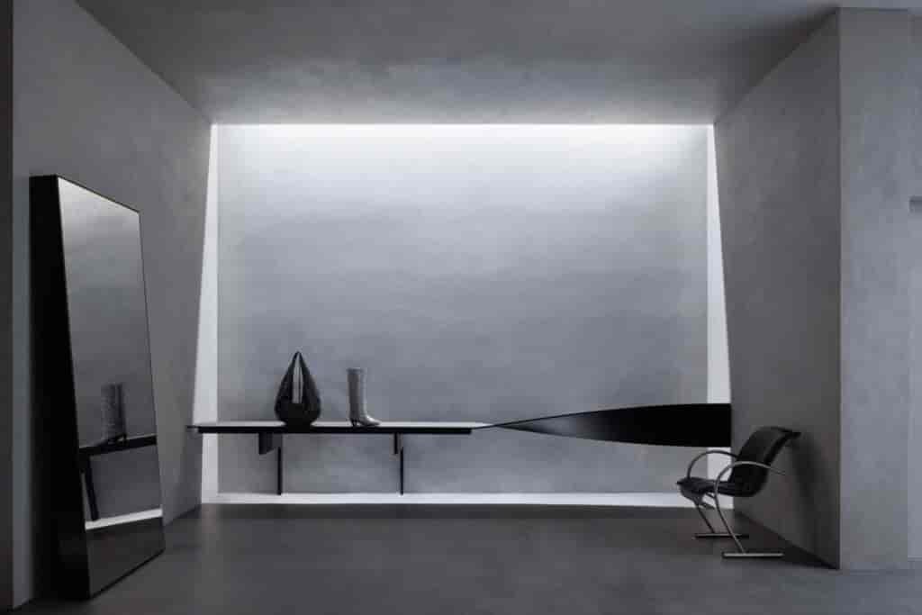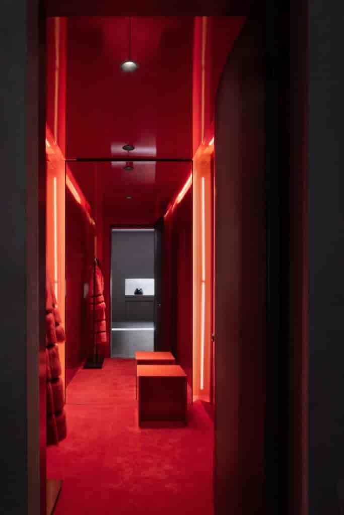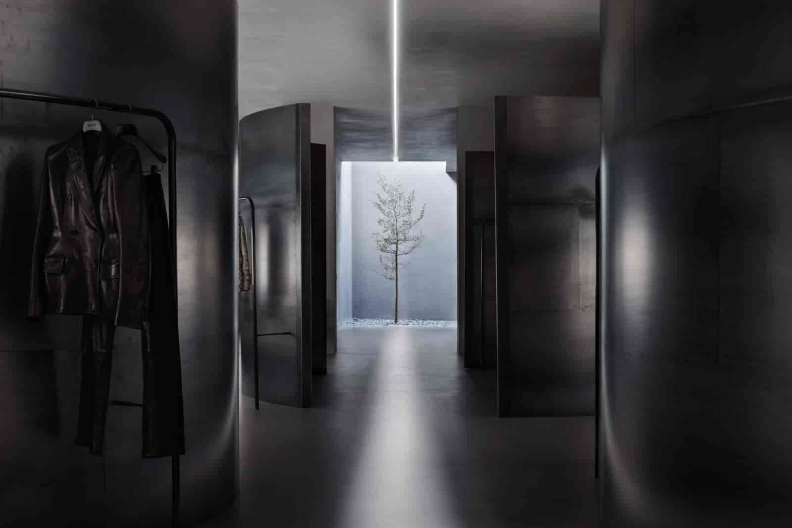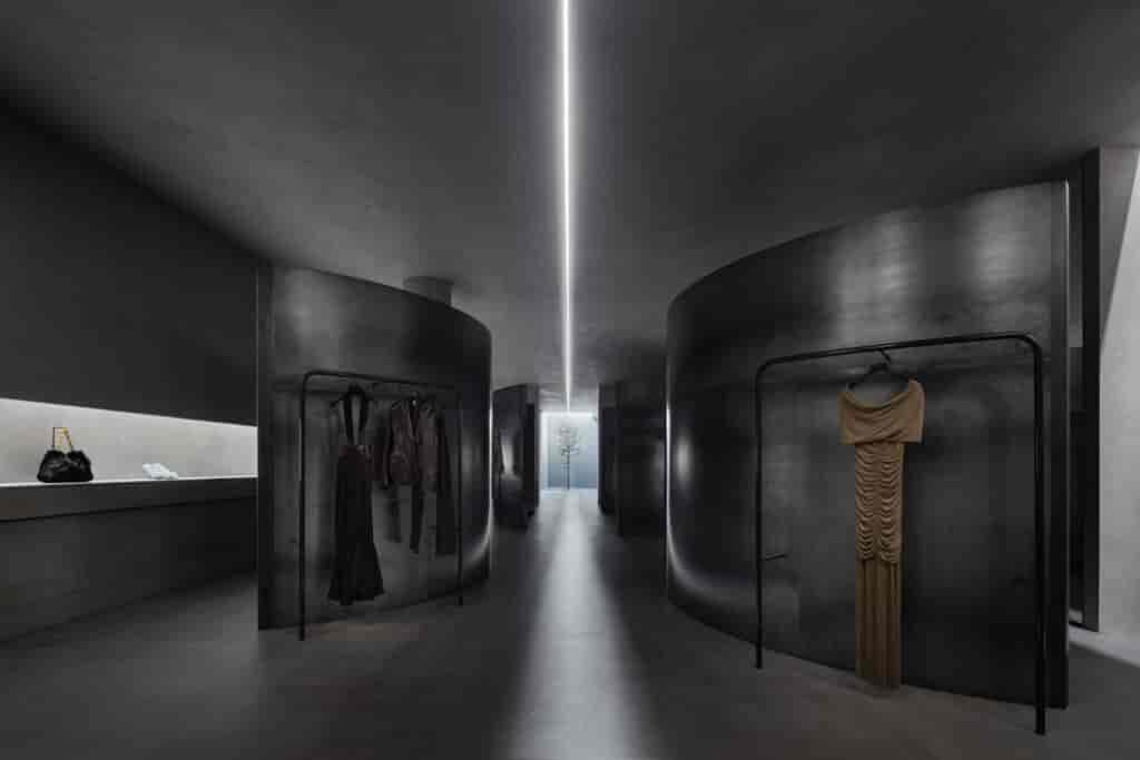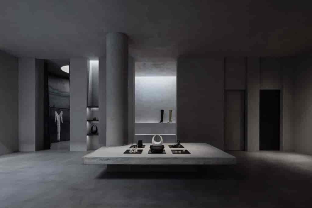 Markanın ürünlerinin mekana yerleştirilmesindeki minimal tavır, hem tasarımın güçlü ve soğuk duruşunun hem de tekil olarak sergilenen tasarımların ayrı ayrı öne çıkmasına yardımcı oluyor. Mekandaki her öge sonradan yerleştirilmiş gibi değil de tasarımın birer parçasıymış ve oraya aitmiş gibi hissettiriyor ve mağazalarda çok da alışık olmadığımız bir hiyerarşi yaratıyor.