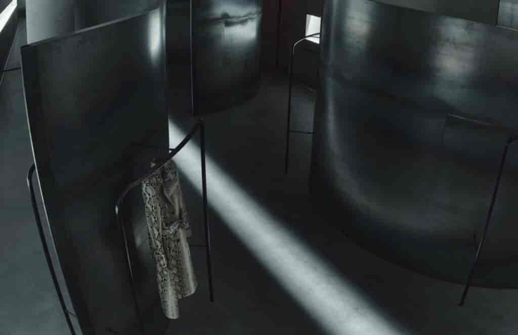 371 metrekarelik sergileme alanında yer alan dört kıvrımlı çelik duvar, teşhir raylarında sergilenen hazır giyim koleksiyonlarını çerçevelerken mekandaki keskin geometrilerle kontrast oluşturuyor.