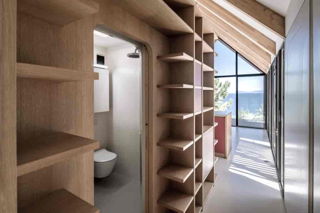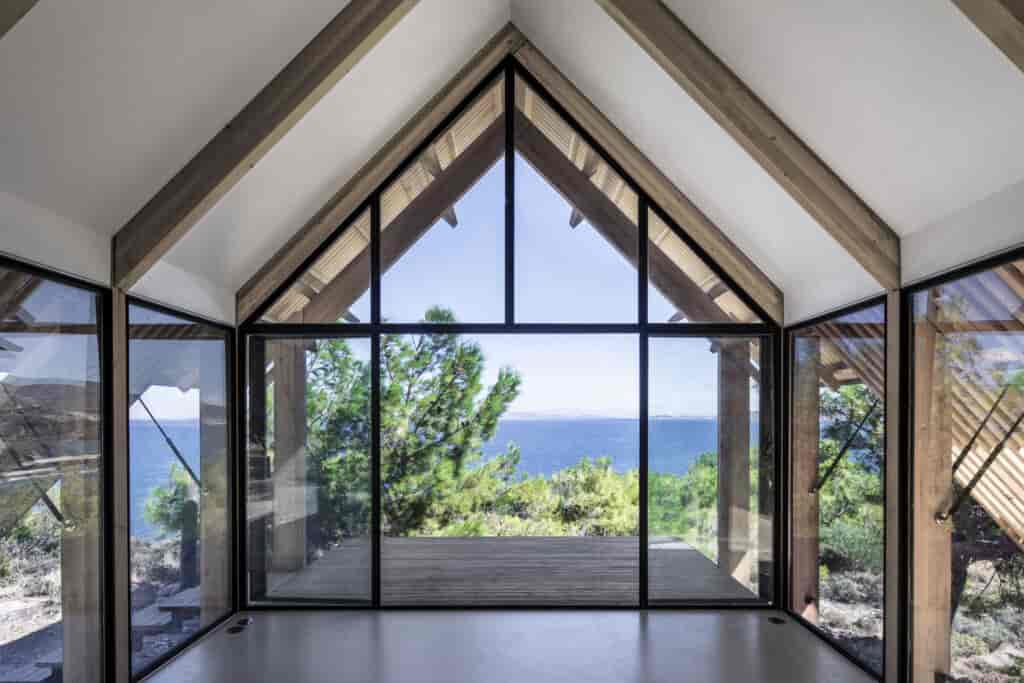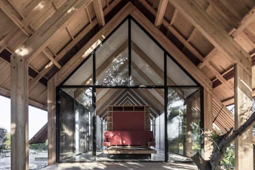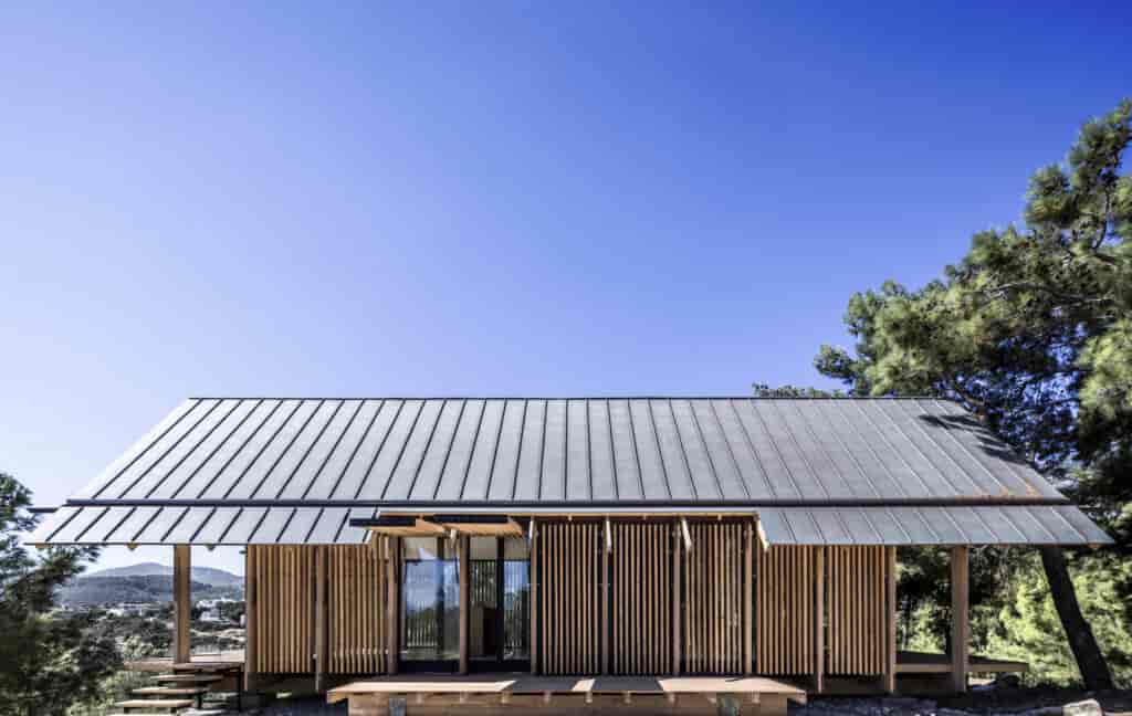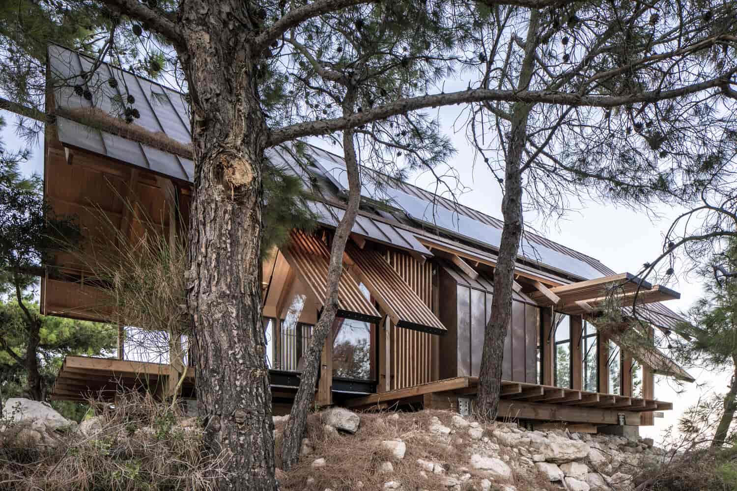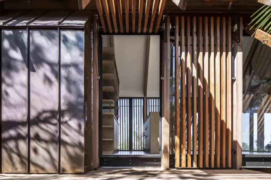Yapının kabuğunu tanımlayan en önemli unsurlar strüktürel çerçevesi ve cephedeki hareketli ahşap panelleri olmuş. İç mekan, depolama alanları ve farklı fonksiyonlar barındıran servis bölmelerinden oluşuyor. Yapı farklı mekanlara adapte olabilecek şekilde tasarlanmış olsa da doğa ile ahenkli bir birliktelik oluşturmaya müsait bir karaktere sahip. Strüktürel elemanlar dışında cephenin neredeyse tamamen camla kaplı olması bulunduğu çevrenin manzarasının maksimum oranda deneyimlenebilmesine olanak tanıyor. Günün farklı saatlerinde manuel olarak çalıştırılabilen ahşap gölgelikler hem içeriyi hem de ahşap terasları güneşten koruma imkanı sağlıyor. Panellerin hareket kabiliyeti aynı zamanda değişen güneş ve rüzgar koşullarının oluşturduğu mikro iklimsel dış mekan deneyimleri sunuyor.