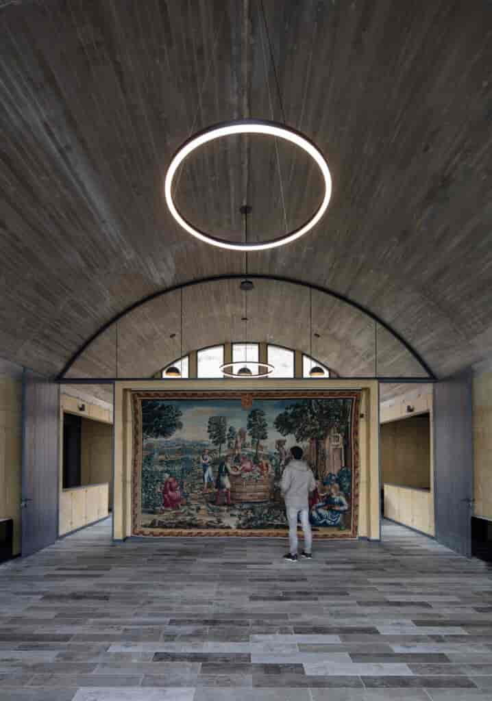 Ofiste çalışma mekanlarının yanı sıra servis alanları olarak tasarlanan tuvaletler ve mutfak da bulunuyor. Şarap mahzeni ise alt katta yer alıyor. Yapının dışarıdan en dikkat çeken unsurlarından olan dev tonozları içerde de etkileyici mekanlar oluşturmaya devam ediyor. İç mekanda kullanılan daha rasyonel formlar kıvrımlı cephe ile kontrast oluşturarak cephenin etkisini daha da artırıyor.