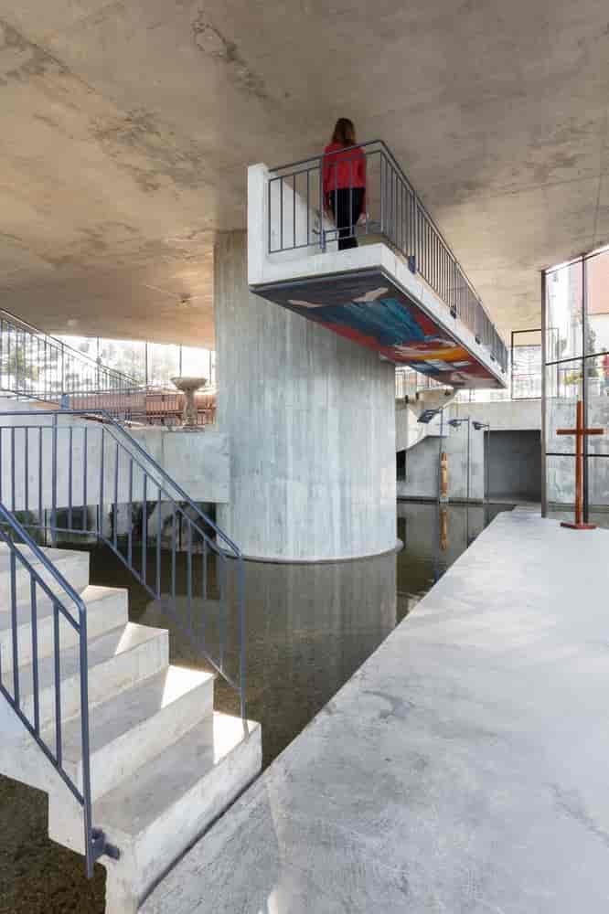 1987’de inşa edilen şapel, Saint Peter’ın Hristiyanlığın temel taşı olarak görülen rolünü simgeleyen devasa silindirik bir kolon etrafında düzenlenmiştir. Paulo Mendes da Rocha pek çok projesinde olduğu gibi burada da beton malzemenin yarattığı ağır etki ile camın hafif ve kırılgan hissiyatı arasındaki zıtlığı ön plana çıkarmıştır. Zemin seviyesinde yaratılan su tabakası beton yüzeylerin altında ışıklı yansımalar oluşturarak tasarıma hafif bir görünüm kazandırmaktadır.