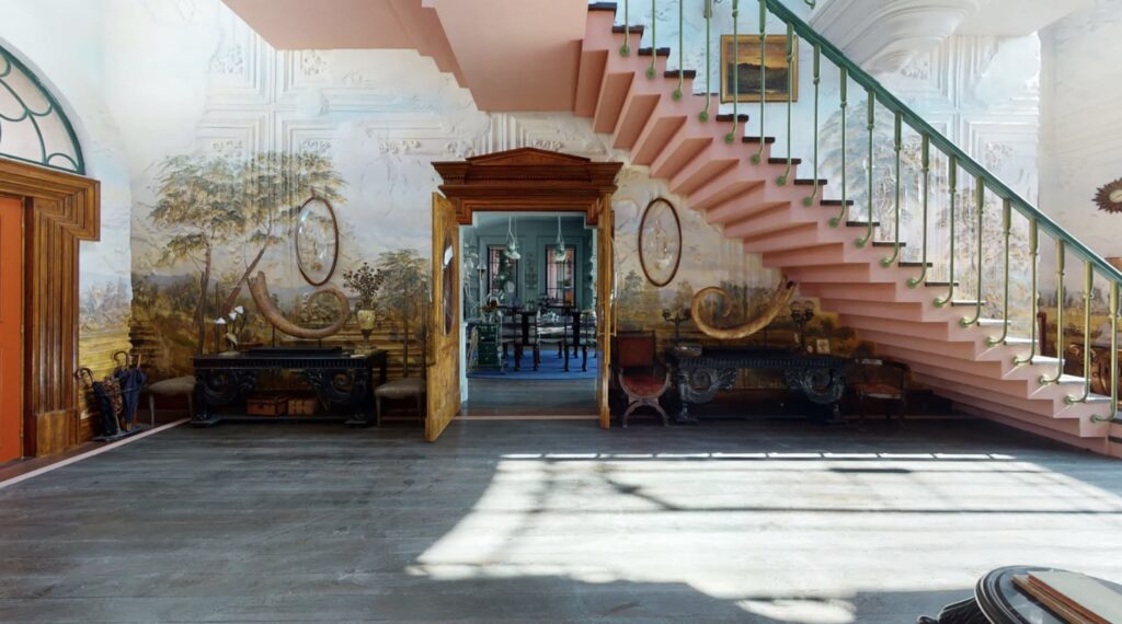 Büyük yemek sandalyeleri ve baş üstü ısı lambaları gibi absürt unsurlar, yemek odasındaki duvarlarda yer alan tabaklar gibi sıradan İngiliz dekorasyon motifleriyle harmanlanmış.