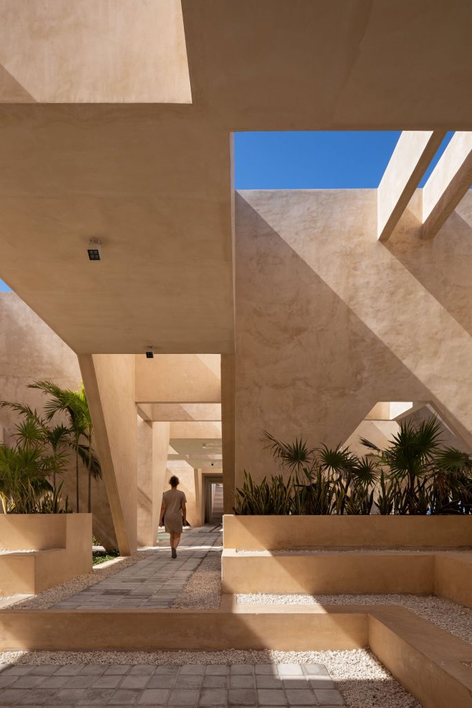 Çatıların altından geçen yürüyüş yolları, havuzlu ve bahçeli açık hava bölümlerinden dolanarak mekanları birbirinin içine katıyor ve akışkan bir düzen oluşturuyor.