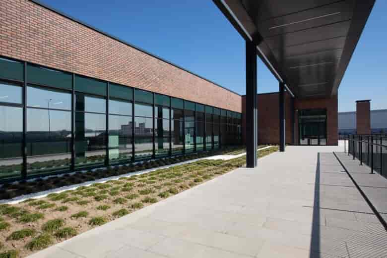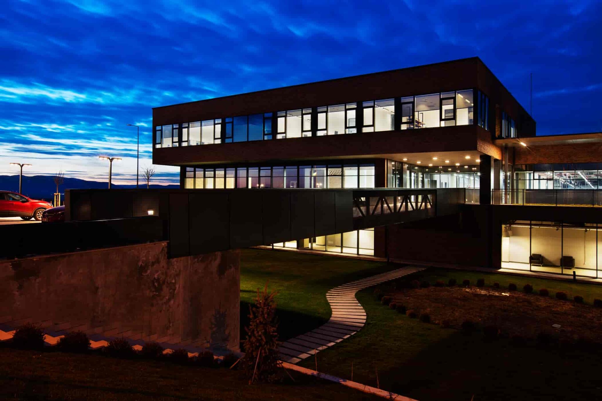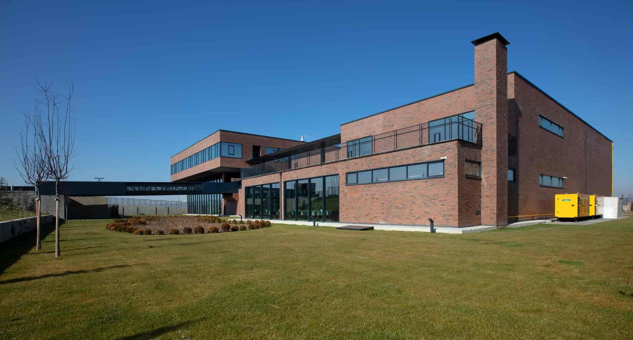 Yapı kübik basit formuna rağmen kendisini çevreleyen sanayi tesis dokusunda bir röper noktası olarak öne çıkmaktadır. Tasarımda ana yola göre düşük kotta bulunan arazinin topoğrafyası bir avantaj olarak yorumlanmış ve ön bahçe yol kotunda tesviye edilmemiştir. Bunun sonucunda üst zemin kat yola köprü ile bağlanmış ve alt zemin kat, kuzey cephede olduğu gibi, güney cephede de bahçeye açılabilmiştir. Buraya cephe veren sosyal koridor ve yemekhanenin önündeki geniş peyzaj alanında biyolojik bir gölet kurgulanmış ancak henüz yapımı tamamlanmamıştır.