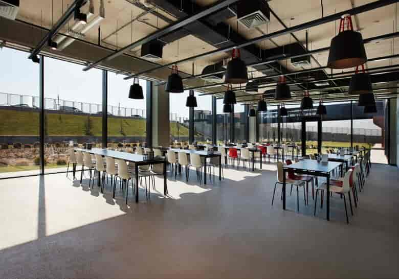Tasarım sürecinde endüstriyel tesiste çalışanlar için motivasyonu arttıracak huzurlu ve aydınlık alanlar yaratılması önemsenmiştir. Gün ışığı ile de aydınlanan atölyelerde uzak dağların manzarasını yakalayan pencereler maksimum boyutlarına ulaşır.