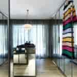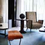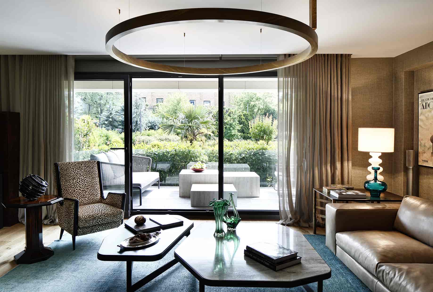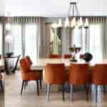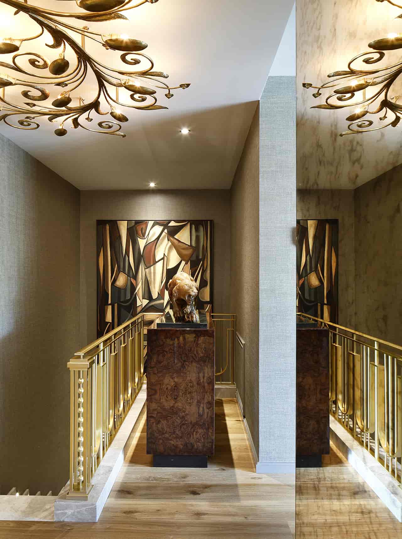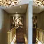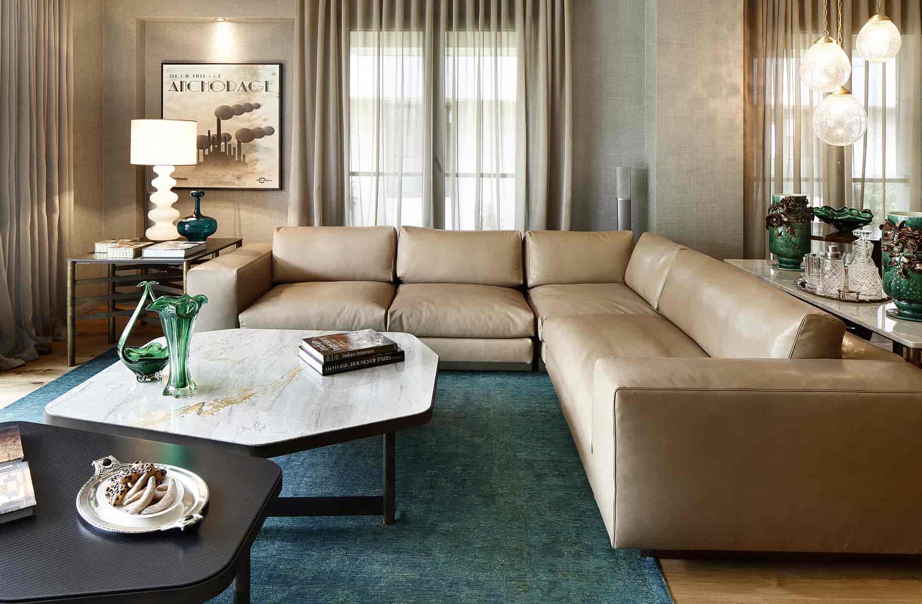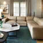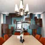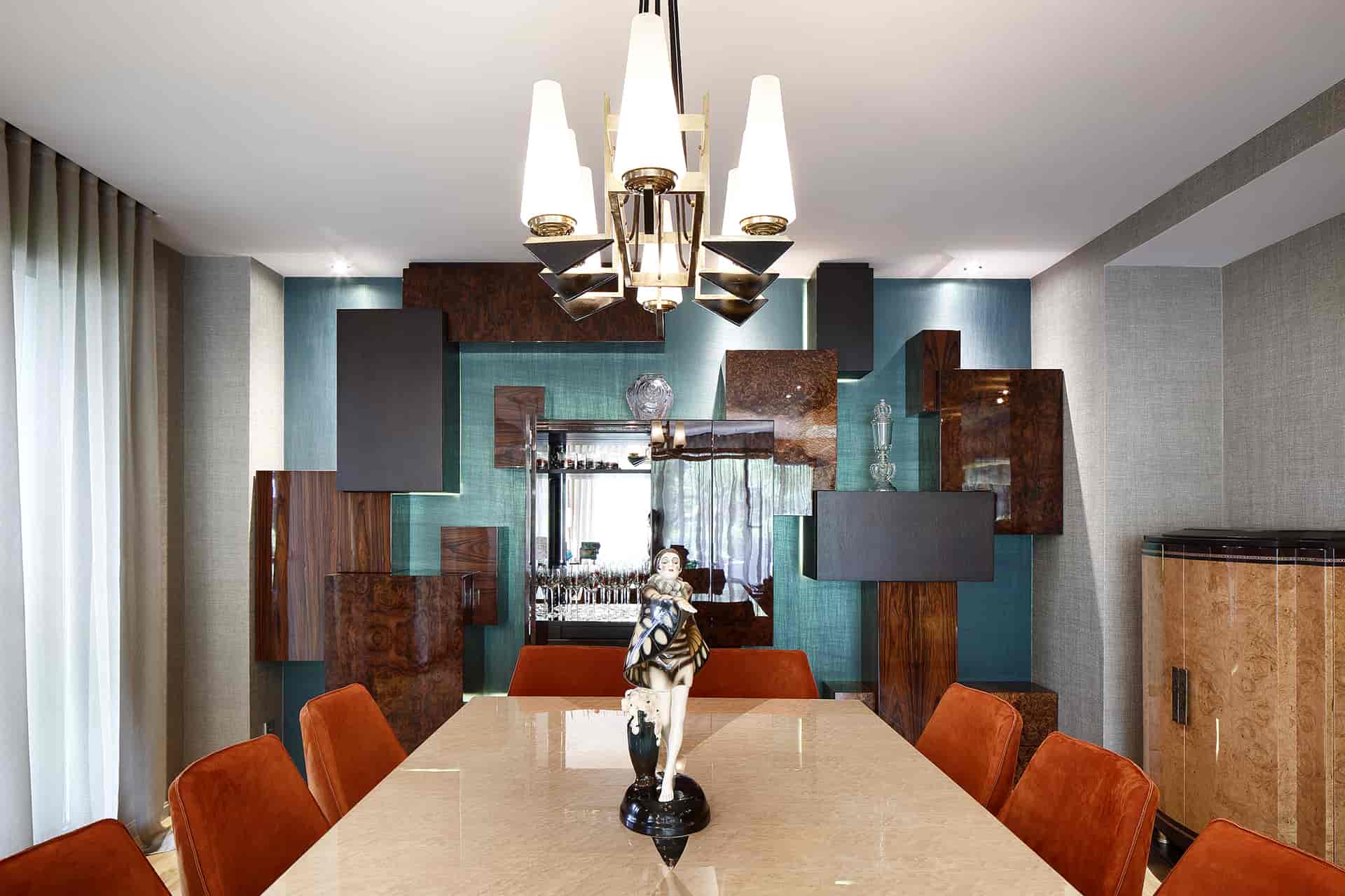 "-- İki kata bölünmüş ve alçak tavanlı bu daireye kişlilik kazandırmak, ışıltı vermek, konukların daha çok gece ağırlanacaklarını da düşünerek bir kimlik yaratmalıydım. Bire bir aktarmak yerine Art Deco'ya öykünen, egzotik sıcak ahşap tonlarını, dore ışıltısını , bej ve zümrüt yeşilinin enerjisini yayan bir atmosfer yaratmak istedim. Bunun için özellikle salonda farklı gösterişli doğal ahşap kaplama oyunlarını bazı noktalarda kullandım. özellikle yemek bölümünün aksında yer alan asimetrik, kübik sergileme alanında... Salonun en sevdiğim bölümü yemek masasının aksında bulunan geometrik sergi duvarı. Arka fonda zümrüt rengi el işi pano ile derinlik kattığımız bu duvarda, hem depolama, hem bar kullanım alanları, hem açık bölümlerinde obje teşhir hedeflendi. Ama her bölümde kullandığımız egzotik farklı ahşap kaplama oyunları ve kutucukların boyut farklılıkları, birbirleriyle ilişkileri, inanılmaz bir düzen ve devinim yarattı... Tüm bu kurgunun yoğunluğu, düz, sade yemek masasını ve iddialı yemek iskemlelerini i bütünledi... Yemek masası aydınlatması dönemin özel tasarımlarından...